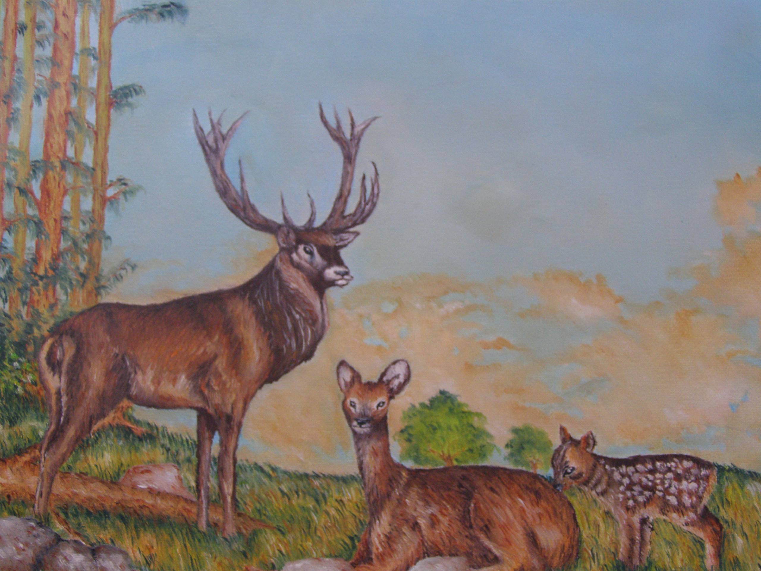 Na obrazie widzimy urokliwą scenę z udziałem jeleni w spokojnym, leśnym zakątku. Kolory są stonowane, pełne zieleni, brązów i błękitów, co tworzy atmosferę ciszy i harmonii. W centrum uwagi stoi majestatyczny jeleń z rozłożystym porożem, obok niego leży łania, a nieopodal pasie się młode jelonki. Kompozycja jest wyważona, z każdym elementem starannie umieszczonym. Atmosfera obrazu to idylliczny wypad do natury, gdzie czas zdaje się płynąć wolniej. Malarska technika może przypominać tradycyjne malarstwo olejne, z miękkimi pociągnięciami pędzla, które dodają dziełu ciepła. Artyzm? It’s all about capturing the essence of nature. Patrząc na to, można się poczuć, jakby się zgubiło w pięknie przyrody, z dala od zgiełku codzienności. Pisałbym o tym godzinami, ale jeden element ciągnie wzrok dalej, ku błękitnemu niebu, co może budzić w nas uczucie nadziei i spokoju. „Jelonki są takie słodkie!” powiedziałoby 7-letnie dziecko, i miałoby rację. Obraz ten jest jak delikatne westchnienie natury, które zaprasza do zatrzymania się na moment i podziwiania prostoty życia.