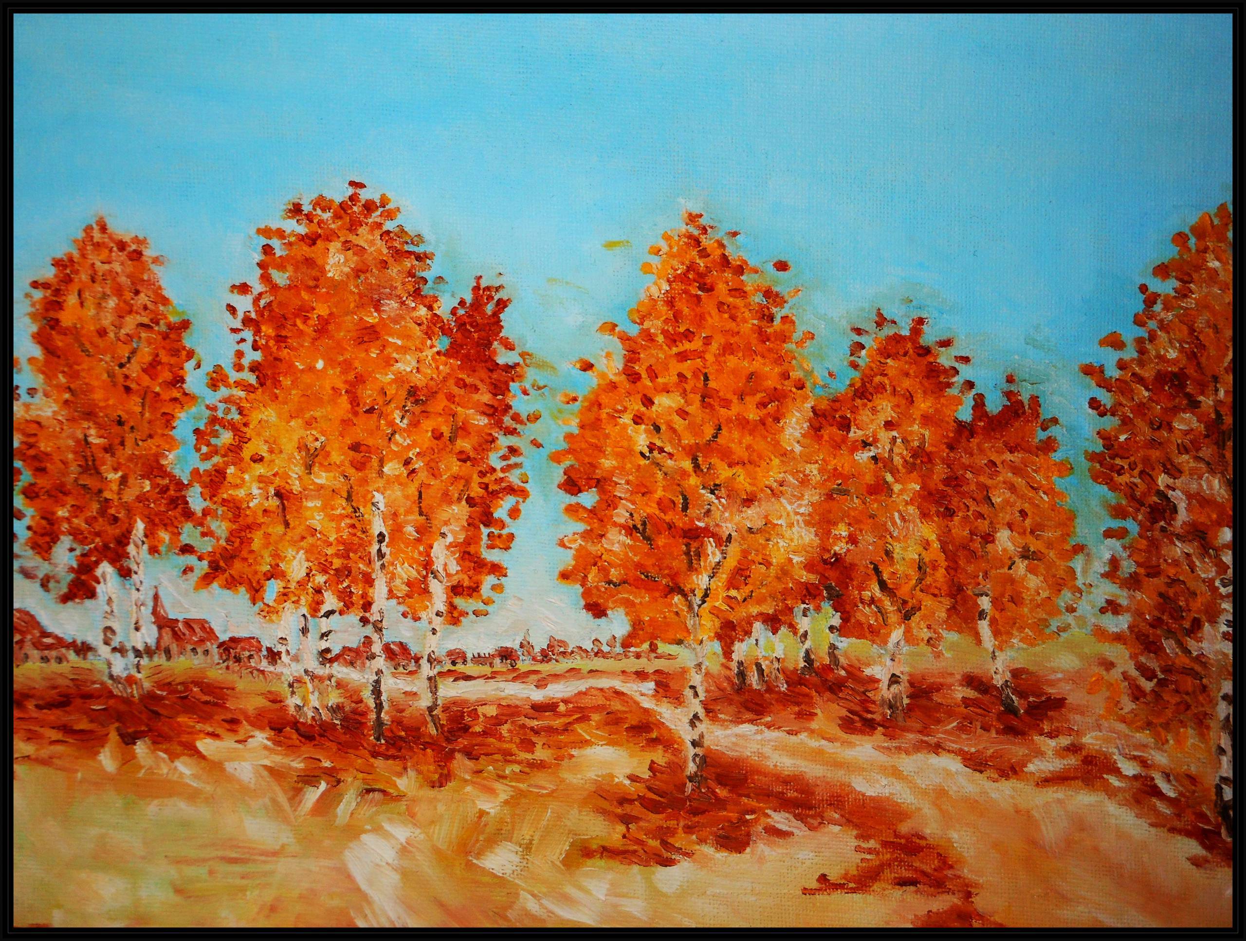 Na tym obrazie dominują ciepłe, jesienne barwy. Intensywne oranże i czerwienie liści kontrastują z jasnym, błękitnym niebem. Drzewa, przypominające brzozy, układają się w rytm, tworząc harmonijną kompozycję. Pnie są białe z czarnymi plamkami, co dodaje im autentyczności. Tło jest delikatne, lekko zamglone, jakby mgiełka jesiennego poranka osiadła na polach. Atmosfera dzieła jest spokojna i nostalgiczna. Można niemal poczuć zapach jesieni, usłyszeć szelest liści pod stopmi. Styl artystyczny jest zbliżony do impresjonizmu – szybkie, impastowe pociągnięcia pędzla nadają obrazowi dynamizmu i życia. Artysta użył techniki, która sprawia wrażenie, jakby wszystko drżało od jesiennego wiatru. Dzieło może budzić różne emocje – od ciepła i spokoju po tęsknotę za minionym latem. Można sobie wyobrazić spacer po tej ścieżce, gdzie świat jest "perfectly" in order. Jeden liść wygląda jak motylek, powiedziało by dziecko. Refleksja nad nieuchronnością czasu miesza się z radością z obserwowania piękna natury. Jakie to fascynujące, że zwyczajne drzewa mogą opowiedzieć taką historię.