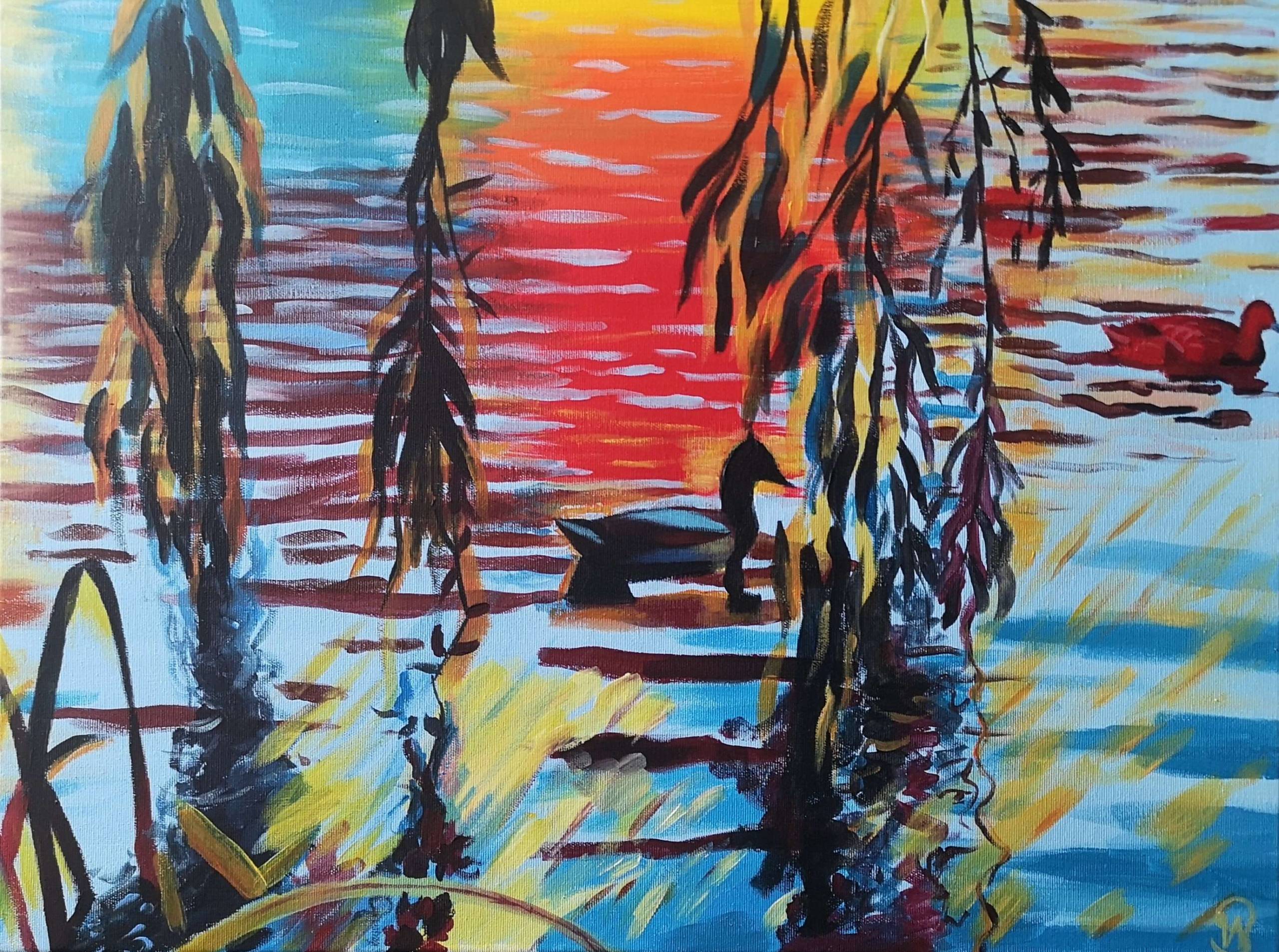 Obraz emanuje intensywnością barw — czerwienie, błękity i żółcie mieszają się w wodnym tańcu. Gałęzie wierzby, delikatnie pochylone, tworzą nieregularne, niemal tańczące kształty, przenikające się z taflą wody. Kompozycja jest dynamiczna, a równocześnie uspokajająca. To taki moment, gdy wieczorem siadasz nad jeziorem i czujesz, jak świat zwalnia. Atmosfera obrazu jest jednocześnie pełna spokoju i dzikiej energii. Artysta zastosował ekspresjonistyczne pociągnięcia pędzla, doprawione odrobiną impresjonistycznego rozmycia. Kolory są żywe, niemalże hipnotyzujące, co sprawia, że obraz wciąga. Emocje, które budzi, mogą być różnorodne. Może to być nostalgia za czasami dzieciństwa, gdy wszystko było proste. "Patrz, kaczuszka pływa!" mógłby krzyknąć siedmiolatek. Dla innego odbiorcy to medytacyjny stan, moment "zen". Jest coś magicznego w tym obrazie - taka "soul-refreshing" chwila, w której można zatonąć choć na chwilę.