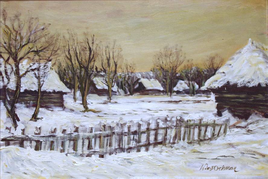 Obraz przedstawia zimową scenerię wiejską, gdzie dominuje biel śniegu i subtelne beże nieba. Białe, puszyste zaspy otulają chałupy z dachami pokrytymi śniegowymi czapami, które wyglądają jak wielkie puchowe poduszki. Kompozycja jest dość prosta, z centralnym punktem w postaci ogrodzenia biegnącego wzdłuż dolnej części obrazu, prowadząc wzrok ku odległym drzewom. Ciepłe, ziemne odcienie balansują chłód bieli, co sprawia, że całość jest przytulna mimo zimowej scenerii. Atmosfera tego dzieła jest spokojna, troszkę nostalgiczna. Przypomina chwile, gdy wszystko jest ciche i uśpione w oczekiwaniu na wiosnę. Artysta zastosował technikę impasto, co daje obrazowi teksturę i głębię. Grube pociągnięcia pędzla tworzą efekt trójwymiarowości śniegu i drzew, niemal czuć zimny powiew wiatru na policzkach. Obraz może wywoływać poczucie spokoju, ale również tęsknoty. Patrząc na niego, przypomina mi się, jak budowałem bałwana z tatą. Jest w tej scenie coś magicznego, co chwyta za serce. A little bit of magic w zwykłym zimowym krajobrazie. Dzieci mogłyby powiedzieć: "To tak jak w bajce, gdzie wszyscy śpią pod śniegiem". Obraz pobudza wyobraźnię i przypomina o ciepłych emocjach związanych z zimą i wiejskim życiem.