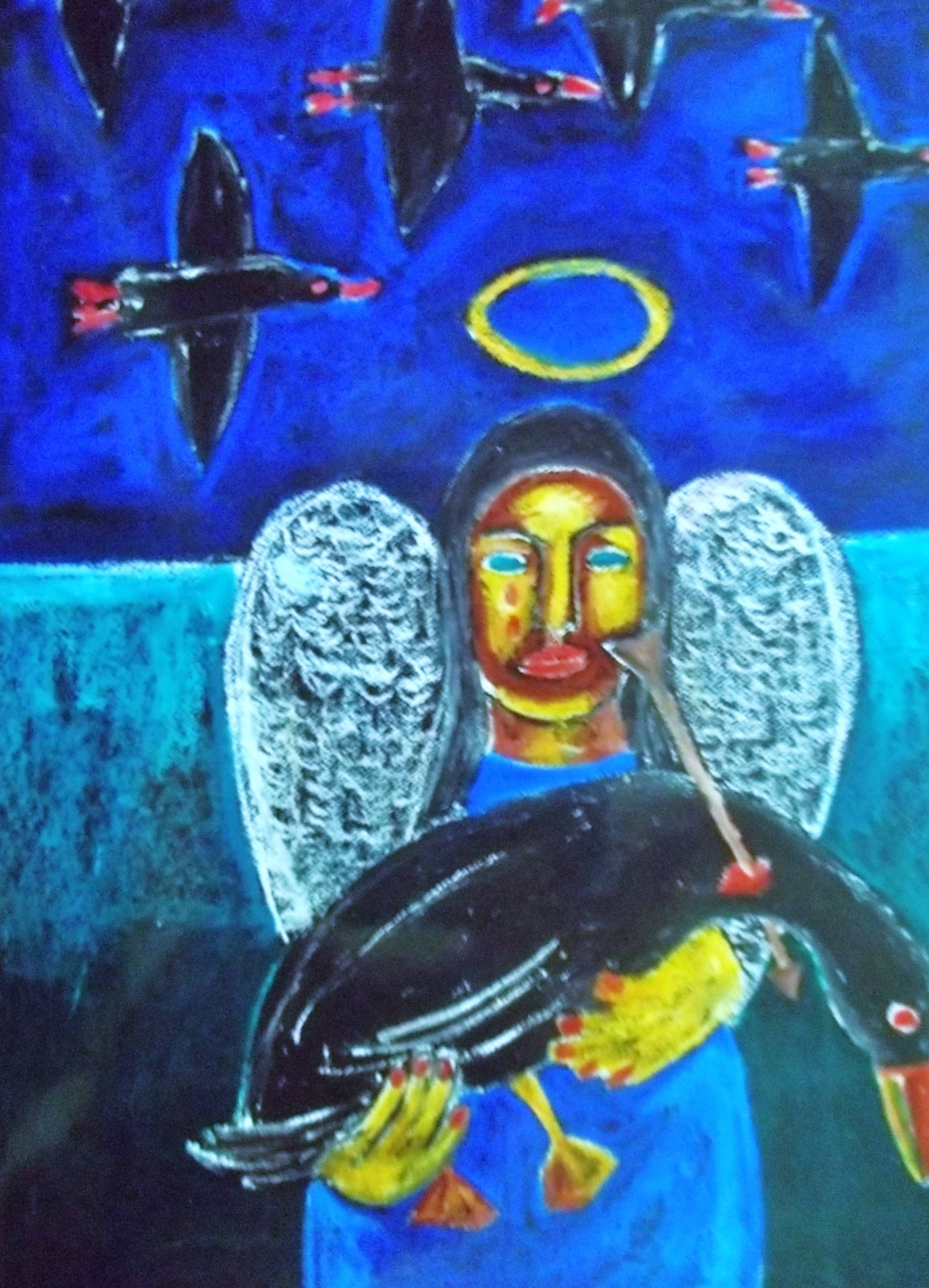 Obraz urzeka intensywnością kolorów – głęboki błękit tła z kontrastującą bielą anielskich skrzydeł i aureolą o złotym odcieniu. Centrum kompozycji zajmuje anioł, którego twarz, choć z wyraźnymi rysami, emanuje spokojem. W rękach trzyma czarnego ptaka. W górze tła widać przelatujące ptaki o rozpostartych skrzydłach, ich zarysy wyróżniają się na niebie – almost like stars. Czyż to nie piękne? Chłodny błękit tworzy atmosferę tajemniczości, jednocześnie niesie ze sobą nutkę melancholii. Styl artysty przypomina technikę pasteli, z wyrazistymi, niemal dziecięcymi konturami. Kolory są nasycone, pozornie przypadkowe, jakby pociągnięcia pędzla prowadziły intuicja i emocje. Całość ma w sobie coś z naiwnej sztuki, co może poruszyć wrażliwość odbiorcy, wzbudzić refleksję o współistnieniu spokoju i niepokoju. Anioł przypomina mi opiekuna, co wzmacnia poczucie bezpieczeństwa i ciepła. Czasem dzieła potrafią przemawiać do nas w magiczny sposób.