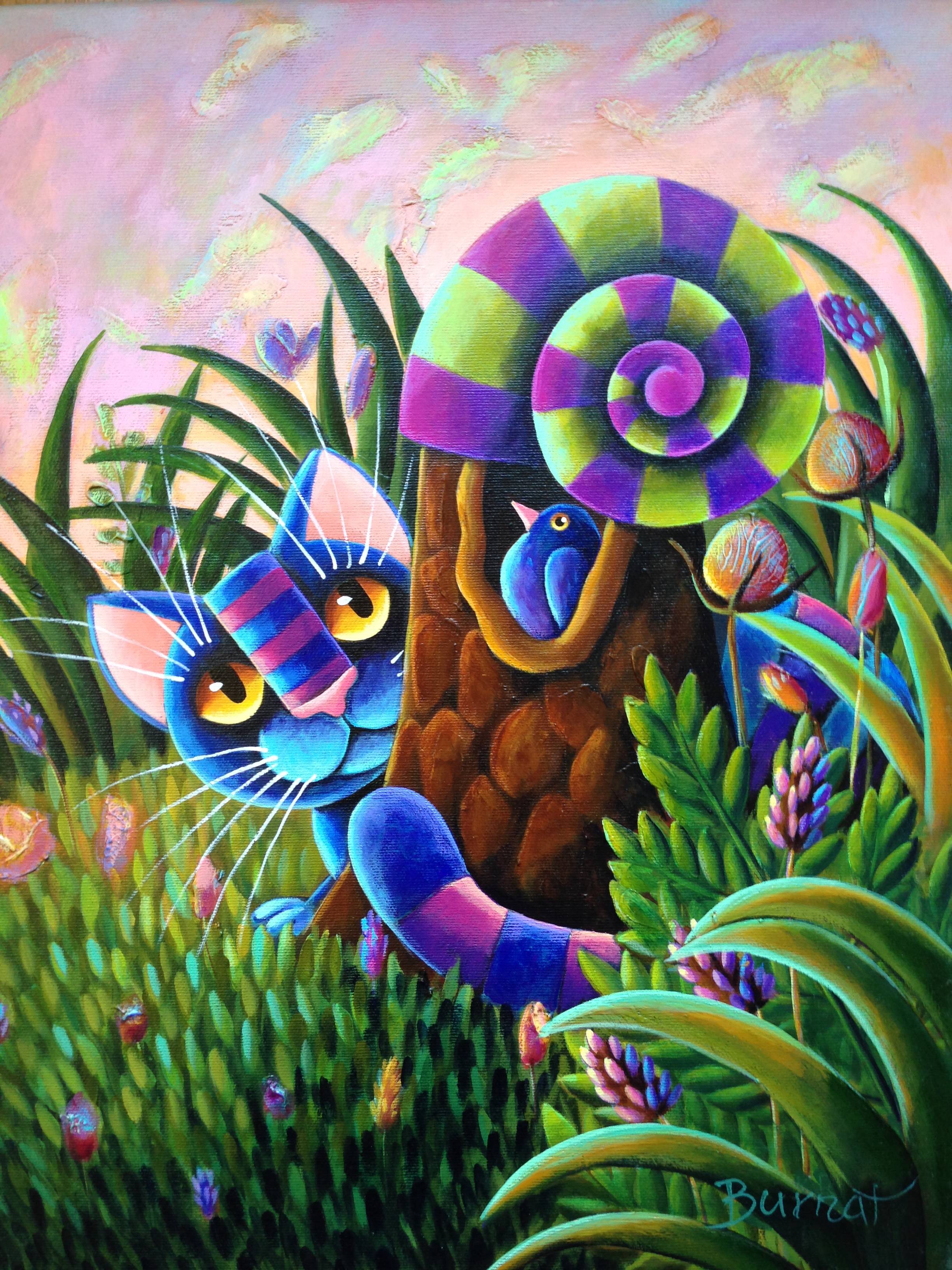 Obraz tętni życiem i kolorami, przyciągając wzrok jaskrawymi barwami i nieco surrealistycznym stylem. Na pierwszy plan wysuwa się niebieski kot, z fascynującymi, wielkimi oczami, które zdają się opowiadać własną historię. Jego futro to kompozycja fioletów i różów, które sprawiają, że zwierzak wygląda jak bajkowe stworzenie. Otacza go bujna zieleń traw i roślin, które falują w delikatnych, miękkich kształtach. A ten ptak w pastelowych barwach, schowany w kraterze gigantycznej muszli? Jak z innej planety! W tle niebo jest rozświetlone ciepłymi pastelowymi różami, co sprawia, że całość kompozycji wydaje się naprawdę magiczna. Atmosfera jest radosna i beztroska, wywołując uśmiech na twarzy. Technika użyta przez artystę to prawdziwa mieszanka, jakby ktoś wziął trochę impresjonizmu z dawką pop-artu. Dla mnie to true masterpiece, które przenosi do innego świata. Obraz budzi w odbiorcy ekscytację i dziecinną ciekawość, przypomina mi historie z bajek, które kiedyś mama opowiadała przed snem. Chciałbym wejść do tego świata i bawić się z kotkiem w trawie! Artysta z sukcesem tworzy wizję świata, w którym wszystko jest możliwe, nawet przyjaźń między kotem a ptakiem.