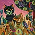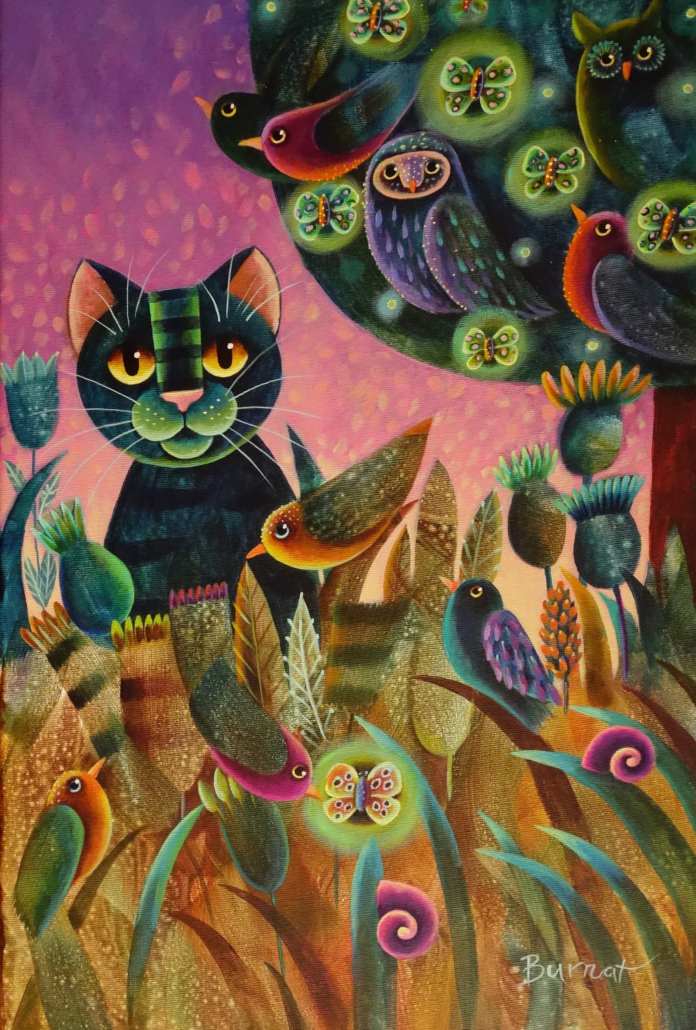 Na obrazie widzimy magiczny świat pełen ciepłych kolorów i ekscentrycznych kształtów. Dominujące tło w odcieniach fioletu otula scenę, dodając jej tajemniczości. Centralnym punktem jest kot o wielkich, żółtych oczach, które patrzą prosto na nas. Obok niego ukrywają się ptaki, motyle oraz sowy, wszystko to w otoczeniu bujnej roślinności. Kształty są uproszczone, nadając dziełu bajkowy charakter. Artysta zastosował fuzję intensywnych barw i miękkich przejść, co nadaje obrazowi styl impresjonistyczny, ale z nutką surrealizmu. Obraz emanuje spokojem, jakbyśmy znaleźli się w sennej krainie, gdzie wszystko jest możliwe. Jest tu coś z magicznego świata "fairytale". Różnorodność kształtów i kolorów może wywoływać u odbiorcy zachwyt lub nostalgię za dzieciństwem. Tak naprawdę to jest to trochę jak zasypianie pod rozgwieżdżonym niebem. Mamo, a kotek tutaj patrzy na mnie! Myśli się krzyżują, kiedy patrzymy na ten obraz. Jest jak portal do miejsca, gdzie wyobraźnia nie zna granic. Samując, ten obraz to uczta dla oka i duszy, zachęcająca do oderwania się od rzeczywistości.