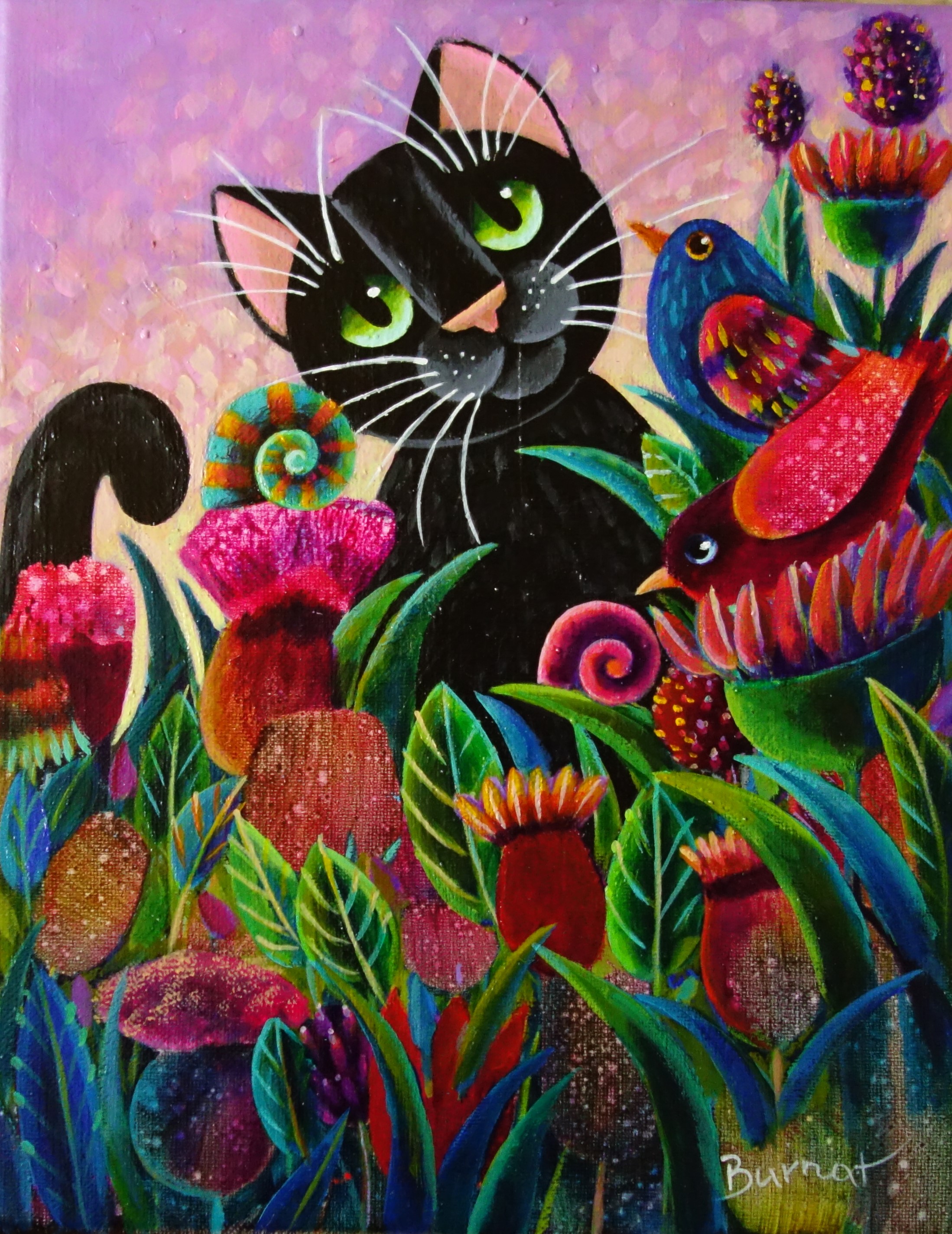Na obrazie widzimy czarnego kota o zielonych, ogromnych oczach, które wydają się nas hipnotyzować. Otacza go gęsta, kolorowa dżungla pełna fantazyjnych roślin i ptaków. Kolory są intensywne, dominują zielenie, fiolety i czerwienie, które tworzą wrażenie jak z bajki. Tło jest różowo-fioletowe, jakby rozmyte, co dodaje całości dreamy atmosphere. Rośliny są pełne detali, ich liście i kwiaty mają egzotyczne kształty, jakby z innej planety. Styl artysty przypomina nieco surrealizm zmieszany z bajkowością. Technika użyta do tej pracy to prawdopodobnie olej na płótnie z wyraźnymi, mięsistymi pociągnięciami pędzla, które dodają tekstury. To dzieło, które wywołuje uśmiech, przywołuje wspomnienia dzieciństwa, kiedy każde podwórko było krainą czarów pełną przygód. Patrząc na tego kota, czuje się jakby zaraz miał do nas przemówić, jak prawdziwy przyjaciel. Ma się ochotę zanurzyć w tej scenerii, zapomnieć o codzienności. Hmm, ciekawe co tam w trawie piszczy, myślę. A kotek jest czarny jak noc! Można poczuć, że jesteśmy na granicy snu i jawy, gdzie wszystko jest możliwe.