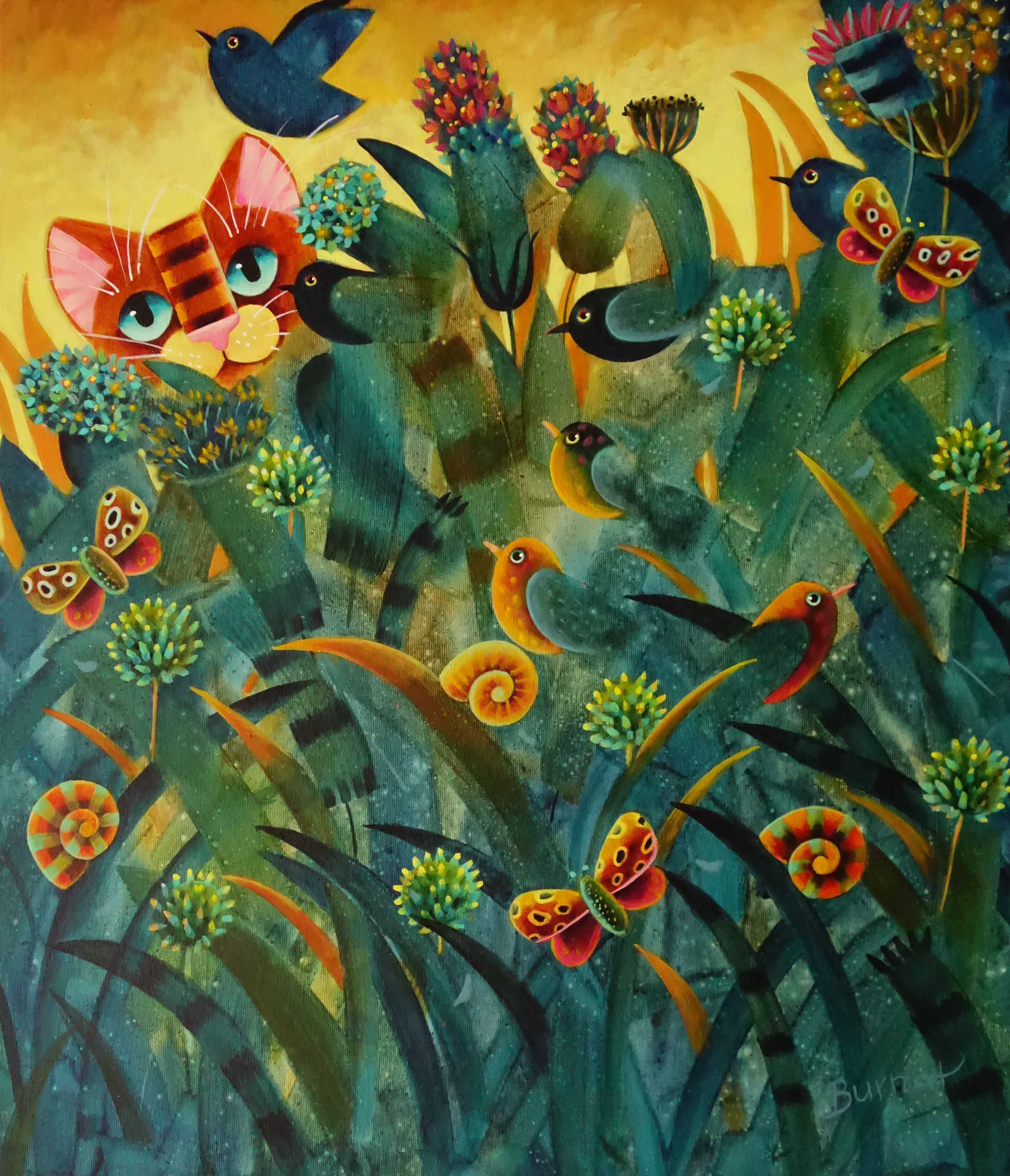 Z obrazu wyskakuje gęsty ogród, rozpięty między złotem nieba a chłodnymi zieleniami liści. Płaskie, wydłużone kształty traw prowadzą wzrok po skosie, a rytm powtarzających się kulistych kwiatów i spiral ślimaków buduje kompozycję. Między nimi błyskają ptaszki jak krople farby, motyle w czerwieniach, no i kot o turkusowych oczach. Kot ma wielkie oczy i bawi się w chowanego. Atmosfera jest lekko baśniowa, niby cisza, ale coś mruczy pod spodem. Malarskość sugeruje akryl, z laserunkami i przetarciami, gdzieniegdzie efekt gąbki, trochę suchy pędzel. Całość brzmi jak ilustracja, lecz naprawde dorosła. Czuję ciekawość, i troszkę napięcia, bo kto kogo podgląda. To wszystko jest po prostu whimsical. Oglądam i myślę, że każda trawa to sekret i że dobrze tu pobłądzić.