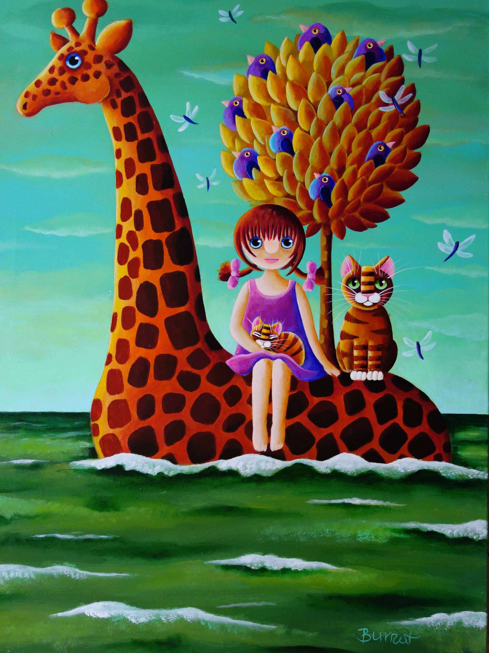 Obraz jest pełen kolorów i fantazji. W centrum widzimy żyrafę, której grzbiet staje się łodzią dla małej dziewczynki i kota. Dziewczynka z uśmiechem na twarzy ma różowe kokardki wplecione w warkoczyki. Obok niej kot patrzy z zaciekawieniem. Na żyrafie rosną drzewa, z których każde jest pełne kolorowych ptaków. To jak piękny sen, gdzie wszystko jest możliwe. Nasycone barwy, takie jak soczysta zieleń wody i błękit nieba, tworzą radosny nastrój. Czuć beztroskę dziecięcego świata, pełna marzeń i przygód. Technika jest żywa, przypomina mi nieco komiksowy styl, gdzie linie są płynne, a kolory kontrastowe. Patrząc na to dzieło, cieżko się nie uśmiechnąć. To jakby zaproszenie do świata, gdzie zabawa nie ma końca. "Ja też tak chcę, mamo!" - krzyknęłoby dziecko, może mając nadzieję na własną przygodę na grzbiecie sympatycznej żyrafy. Może artysta chciał przypomnieć nam, jak ważne jest zachować w sobie część dziecka. Dodaje to pracy 'touch' magii i nostalgię za dzieciństwem. Słownik malowania tu nie istnieje. Artyści, takim jak ten, zwyczajnie bawią się kolorami i formą. Obraz emanuje radością, przyciąga uwagę i budzi ciekawość. Kto nie chciałby wskoczyć na tego grzywacza i popłynąć w nieznane? To uczucie może rozbudzić w nas fantazje, których dawno nie mieliśmy.