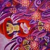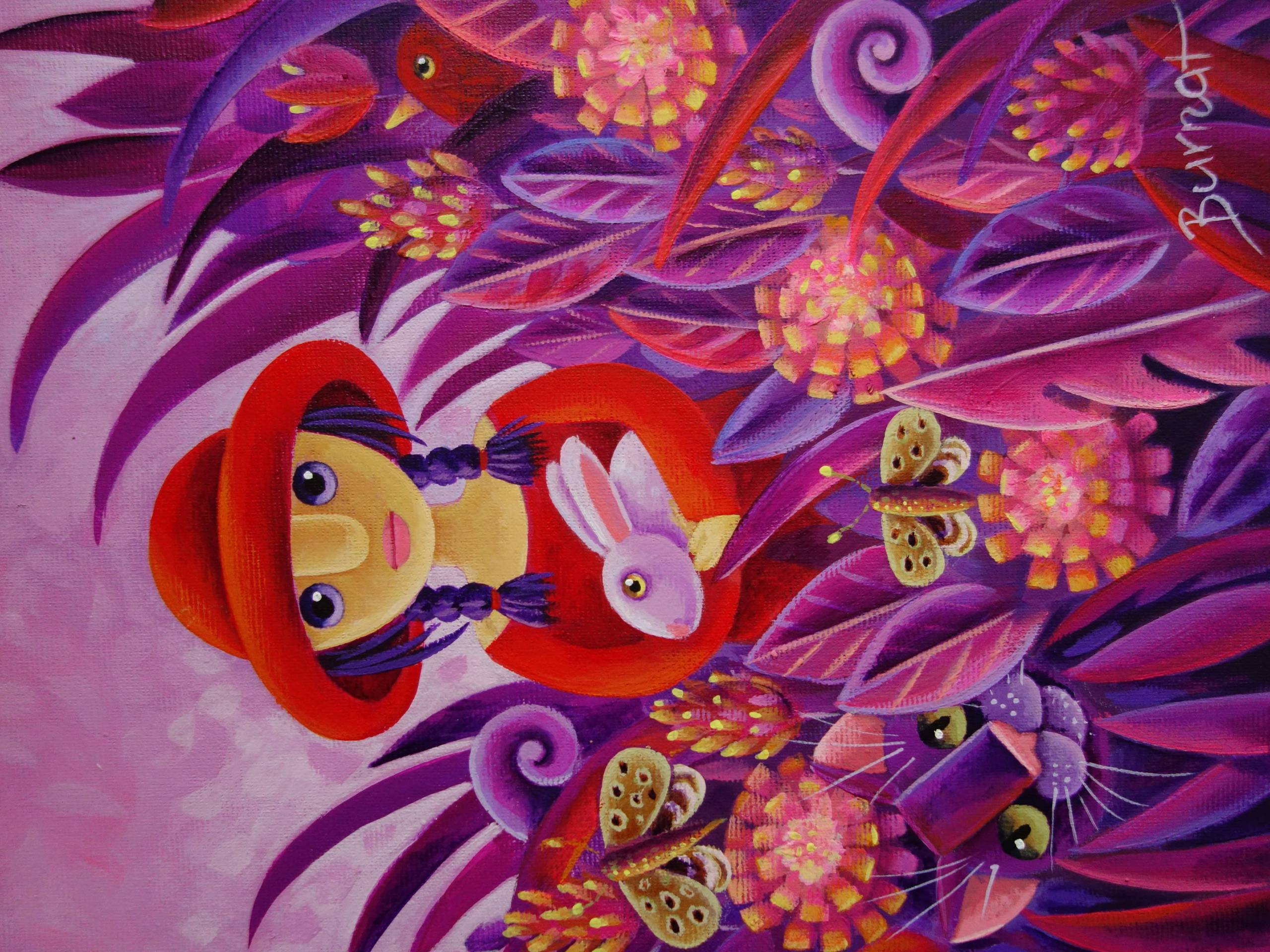 Obraz emanuje eksplozją kolorów, w których dominują soczyste fiolety, róże i intensywne czerwienie. Centralna postać to dziewczynka o dużych, ciekawskich oczach, ubrana w czerwony kapelusz, niczym z bajki o przygodach. Towarzyszy jej uroczy króliczek przytulony blisko. Otaczają ich bogate, barwne liście i kwiaty, a z pomiędzy nich spogląda figlarnie ukryty kot z szelmowskim uśmiechem. Atmosfera obrazu jest magiczna, przypomina senną krainę pełną tajemnic. Artysta zastosował technikę intensywnych, kontrastowych kolorów oraz delikatnie zarysowanych kształtów, co nadaje całości lekkości i dynamiki. Wzory i detale są wyraziste, a jednocześnie harmonijne. Wygląda trochę jak ilustracja z magicznej opowieści dla dzieci. Obraz budzi wiele emocji – od radości i zaciekawienia po nostalgiczną tęsknotę za dziecięcymi marzeniami. Myśli biegną ku beztroskim chwilom, kiedy wierzyliśmy w magiczne krainy. I wiecie co? Chciałbym tam być! Jedno przypadkowe "wow" zawiera się w szczegółach, gdzie motyle zdają się unosić na wietrze. Całość wywołuje uśmiech i wnosi trochę koloru do codzienności. Może ktoś pomyśli: "Chciałbym mieć taki magiczny ogród za domem!".