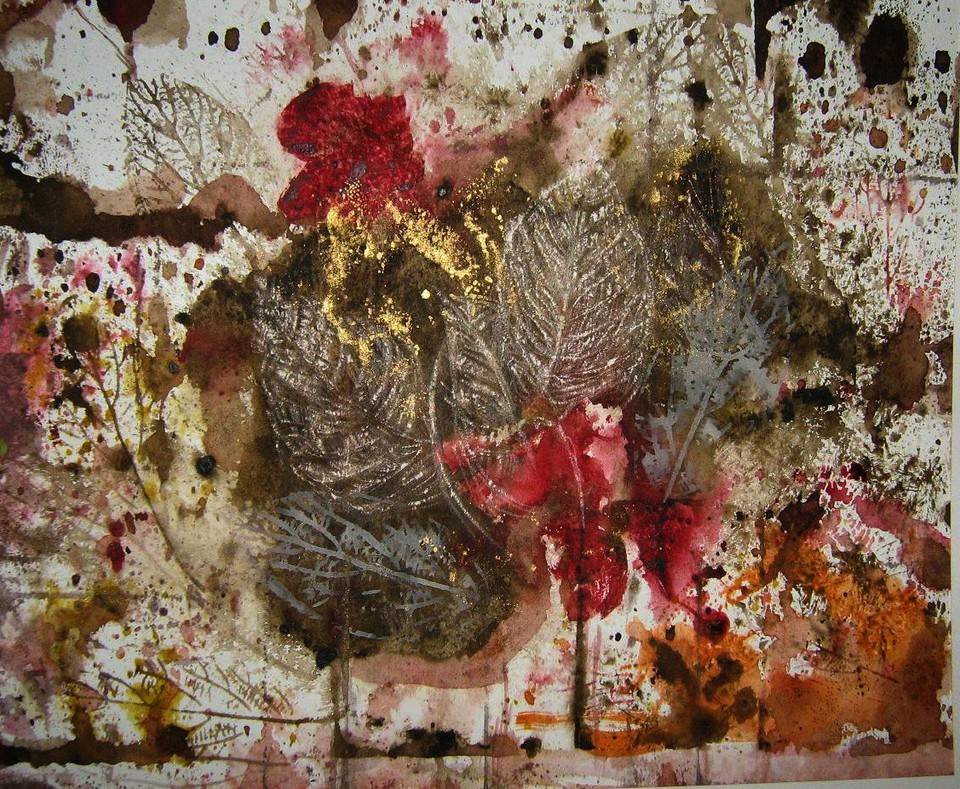 monotypia przedstawiajace jesienne drzewa. czeszowo pokryta zlota farba co ma sugerowac "zlota jesien"
