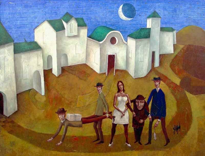 Na obrazie widzimy surrealistyczną scenę na tle białych budynków z zielonymi dachami, pod jasnoniebieskim niebem z gwiazdami. Kompozycja wygląda na nieco magiczną i zagadkową. Postacie, umieszczone w centrum, wydają się być w dziwnym tańcu lub rytuale. Są narysowane w charakterystyczny sposób, z wydłużonymi sylwetkami. Obraz emanuje atmosferą tajemniczości, a pastelowe kolory dodają mu pewnej lekkości, jak sen na jawie. Styl tego dzieła jest nietypowy, być może inspirowany nurtem kubizmu czy surrealizmu. Artysta posłużył się wyraźną linią i geometrycznymi kształtami, co sprawia, że obraz jest bardzo graficzny. Patrząc na niego, można poczuć się trochę zagubionym, jakbyśmy znaleźli się w innej rzeczywistości. To wszystko sprawia, że pojawia się pytanie: co właściwie dzieje się na tym obrazie? Może to przedstawienie poszukiwania swojego miejsca w świecie lub ukazanie, jak bardzo różnimy się od siebie. Jedno jest pewne: obraz przyciąga i intryguje. A tam jest księżyc, jak z bajki! Created a dreamy, almost mystical feeling with an odd charm, zachęca do dłuższego zatrzymania się. Każdy mógłby zobaczyć w nim coś innego, coś swojego. Szalone, ale fascynujące.