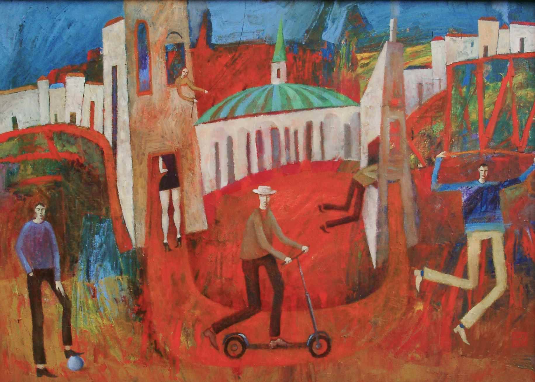 Obraz tętni życiem. Kolory są intensywne, dominują czerwienie przechodzące w pomarańcz i błękity. Architektura tak jakby wzięta z marzeń. Ściany budynków przeplatane sylwetkami ludzi. Jeden mężczyzna na hulajnodze śmiga w kapeluszu, a inna postać wygląda z okna jakby szukała kogoś w tłumie. Kompozycja jest dynamiczna. Formy architektoniczne zakręcone jak serpentyny nadają ruch i życie. Cała scena wydaje się lekko surrealistyczna, jak z innego świata. Nastrój jest pomiędzy codziennością a snem. Moment przyjemnego zagubienia. Trochę jak w bajce, gdzie wszystko może się zdarzyć. Styl obrazu jest ekspresyjny, odważne pociągnięcia pędzla nadające wyrazistości. Trochę tak jakby artysta chciał pokazać tęsknotę za swobodą. Dzieciak powiedziałby: „Ten pan na hulajnodze jest szybki jak błyskawica!”. Obraz wzbudza u mnie ciekawość — co dalej z tymi ludźmi się stanie? English word: vibrant. Ogólnie to dzieło sprawia, że zastanawiasz się nad chaosem codziennego życia.