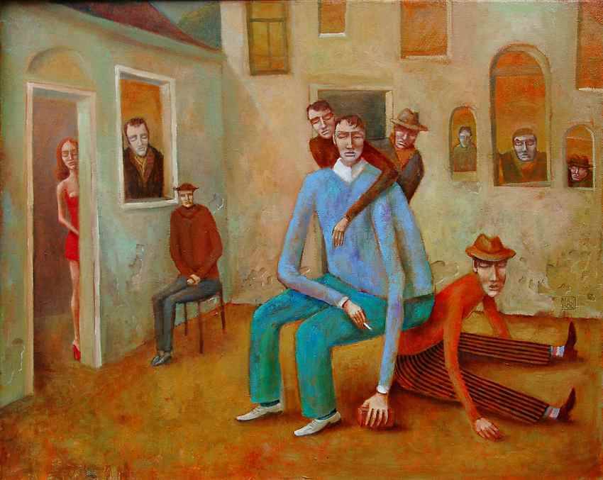 Obraz jest pełen tajemnicy i surrealizmu. Dominują tutaj ciepłe, ziemiste barwy z odcieniami beżów, brązów i delikatnych czerwieni. Postacie o wydłużonych kształtach zdają się zawieszone w nieco nierealnym świecie. Centralna postać w błękitnym stroju przyciąga wzrok, otoczona przez innych ludzi w różnych pozach i wyrazie twarzy. Twarze wydają się melancholijne, jakby zamyślone i nieobecne. Oglądając to, czujemy się trochę jak w "mystery movie" – jest tu coś niejednoznacznego i niepokojącego. Styl artystyczny przypomina techniki kubistyczne, a jednocześnie nawiązuje do wykrzywionej rzeczywistości surrealizmu. Krótkie pociągnięcia pędzla mieszają się z dokładniejszymi detalami, tworząc specyficzną dynamikę obrazu. Patrząc na tę scenę, można poczuć niesamowity spokój, ale też niepokój wynikający z tej dziwacznej kompozycji. Może ktoś się pogubił, tak jak ja czasem gubię się w sklepie. Ten obraz to jak zagadka – dlaczego ci ludzie są tacy smutni? Atmosfera jest przyćmiona, ale niezwykle fascynująca. Trudno oderwać od tego wzrok, jednocześnie czując dziwną potrzebę zrozumienia tej historii.