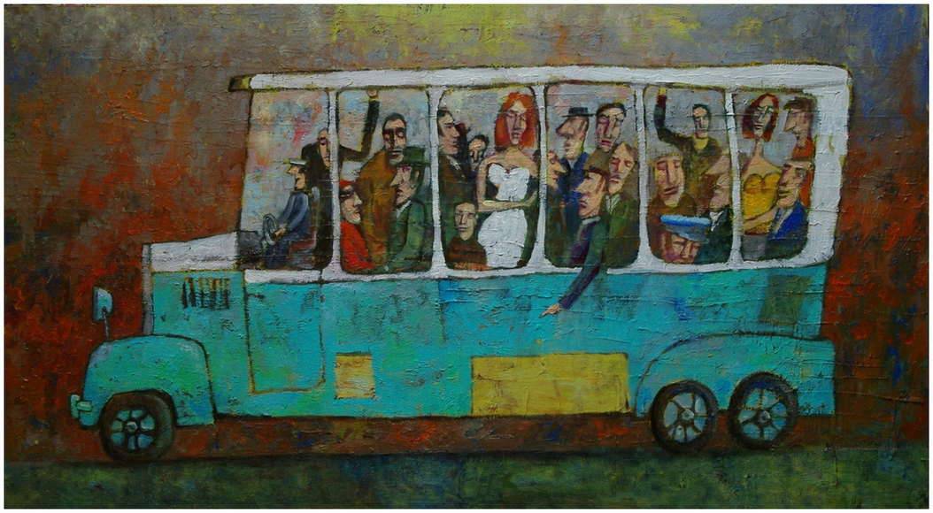 Obraz przedstawia nieco surrealistyczny autobus pełen pasażerów, namalowany za pomocą ciepłych odcieni turkusu i brązów, które zderzają się z odważną czerwienią i rdzawym tłem. Kompozycja wydaje się być chaotyczna, a jednak w tej pozornej niespójności tkwi pewien urok. Pasażerowie są stłoczeni wewnątrz pojazdu, każdy z osobistą historią wypisaną na twarzy. Atmosfera jest melancholijna, ale i humorystyczna, jakby zaraz miało się coś wydarzyć. Artysta zastosował techniki przypominające ekspresjonizm, z grubymi pociągnięciami pędzla i zdeformowanymi kształtami postaci. To dodge-uje nasze spojrzenie od jednego szczegółu do drugiego, jakby próbując powiedzieć nam coś więcej. Obraz jest przepełniony emocjami i każe zastanowić się nad codzienną podróżą przez życie. Dla niektórych to może być po prostu autobus, dla kogoś innego metafora losu. Kolory są jak z bajki, ale twarze pasażerów wyrażają całą gamę uczuć – od radości przez niepokój po zamyślenie. Jak napisałoby to dziecko: "Ten autobus wygląda jak wielka zabawka". Ten obraz może wywołać zarówno uśmiech, jak i refleksję nad naszym codziennym pośpiechem.