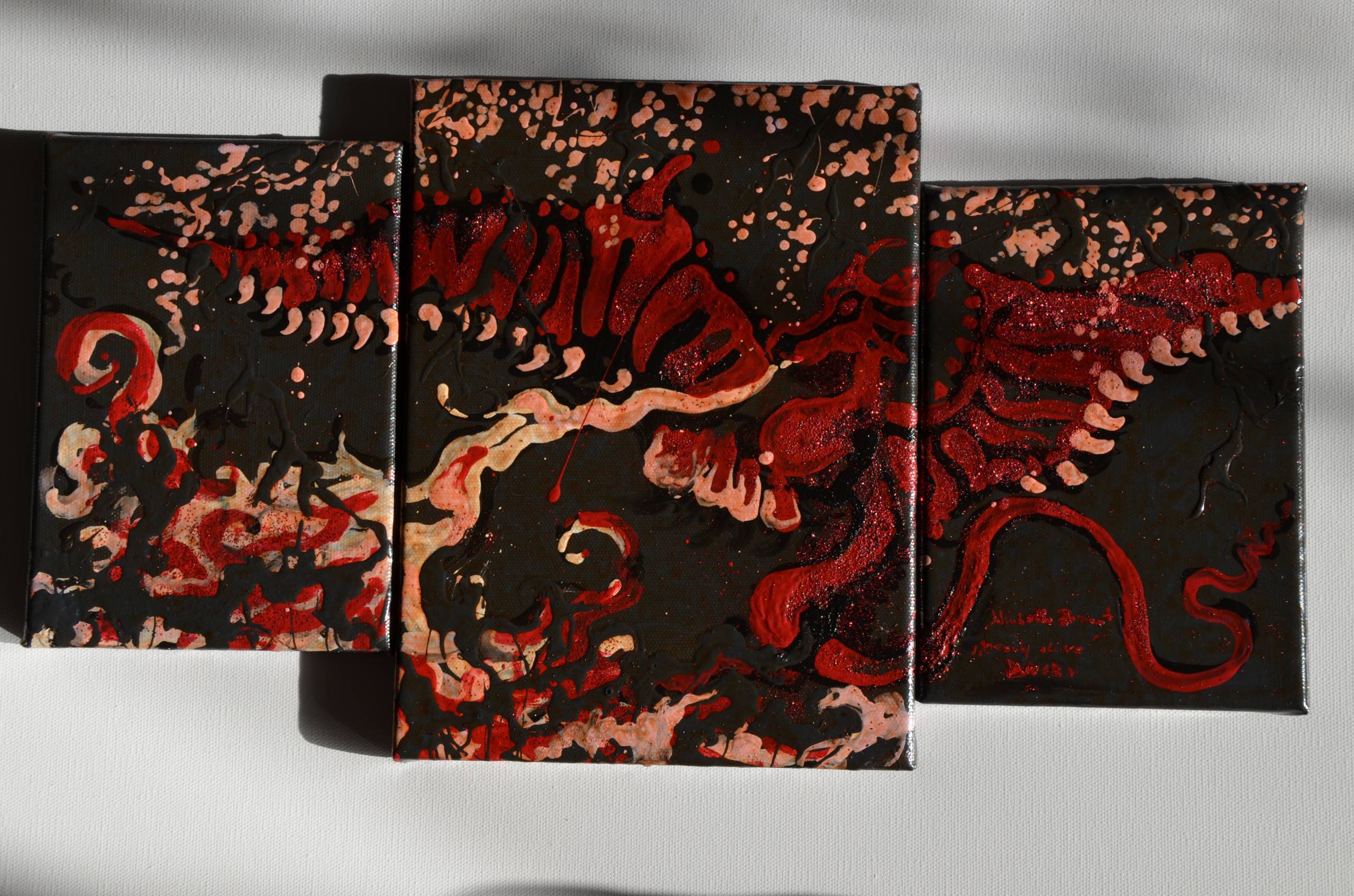 Dzieło Składa się z trzech płócień o formacie : 18/13cm ; 24/18cm ; 18/13cm Całość 44 cm / 24cm Przedstawia Smoka,Malowany techniką akrylową,mieszaną zawerniksowany .