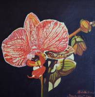 '' Storczyk '' Obraz malowany techniką akrylową ,zawerniksowany,malowane boki obrazu. Dominujące kolory : Czerń-Czerwienie,żółcie,pomarańcze .. Format 30/30 cm
