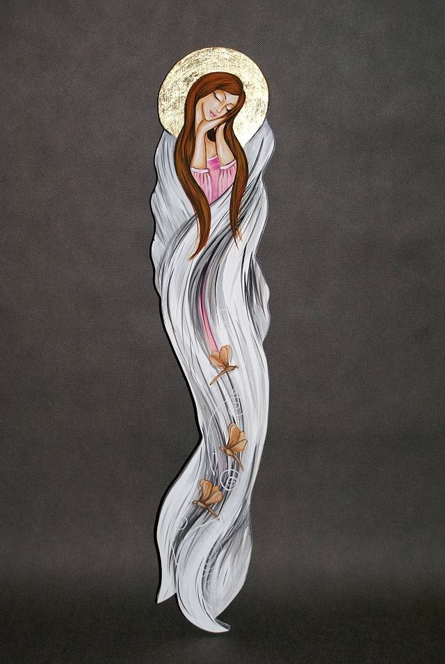 Portret anioła namalowany został farbami akrylowymi na wyciętej, starannie przygotowanej i zagruntowanej, litej desce o grubości 2 cm. Aureola anioła pokryta jest płatkami złota szlagmetal.Obraz posiada z tyłu otwór umożliwiający jego zawieszenie na ścianie. Praca jest zabezpieczona dodatkowo werniksem końcowym, półmatowym. Wymiary wysokość 74 cm, szerokość 15 cm. Anioły Wioletty Niewiarowskiej w wyjątkowy sposób zmieniają nastrój domu, tworząc ciepły i jedyny w swoim rodzaju klimat...roztaczają wokół siebie swoisty czar...oraz przynoszą szczęście swoim właścicielom . Mogą być również wyjątkowym prezentem dla kogoś bliskiego.