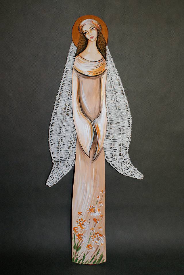 Anioł malowany farbami akrylowymi na wyciętej, starannie przygotowanej i zagruntowanej, litej desce o grubości 2 cm. Skrzydła anioła wyplatane wikliną. Dekoracja posiada z tyłu otwór umożliwiający jej zawieszenie na ścianie. Praca jest zabezpieczona dodatkowo werniksem końcowym. Wymiary wysokość ok.103 cm, szerokość w najszerszym miejscu 42 cm