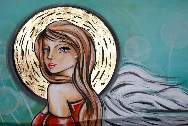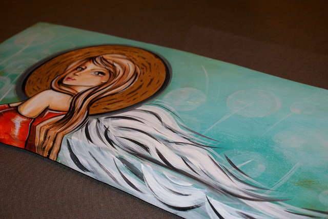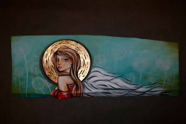Anioł namalowany został farbami akrylowymi na starannie przygotowanej i gruntowanej litej desce brzozowej o grubości ok. 3 cm. W obrazie wykorzystano naturalne kształty drewna dzięki czemu ma on niepowtarzalny charakter .Aureola anioła została pokryta płatkami złota. Praca jest zabezpieczona werniksem końcowym. Obraz posiada z tyłu zawieszki dzięki czemu jest gotowy do zawieszenia. Wymiary: szerokość ok. 79 cm, wysokość ok.30 cm. Anioły Wioletty Niewiarowskiej w wyjątkowy sposób zmieniają nastrój domu, tworząc ciepły i jedyny w swoim rodzaju klimat...roztaczają wokół siebie swoisty czar...oraz przynoszą szczęście swoim właścicielom . Mogą być również wyjątkowym prezentem dla kogoś bliskiego .