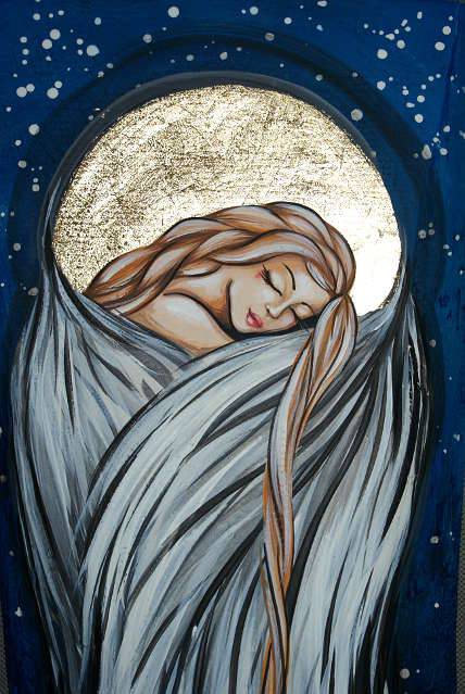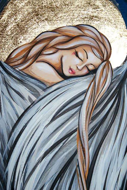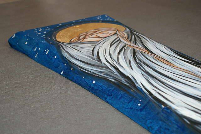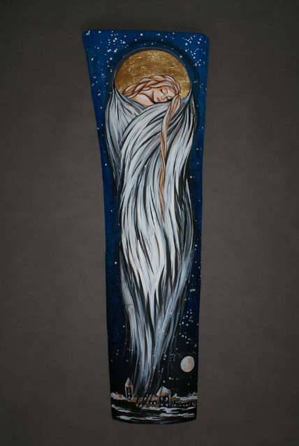 Anioł namalowany został farbami akrylowymi na starannie przygotowanej i gruntowanej litej desce brzozowej o grubości ok. 3 cm. W obrazie wykorzystano naturalne kształty drewna dzięki czemu ma on niepowtarzalny charakter .Aureola anioła została pokryta płatkami złota. Praca jest zabezpieczona werniksem końcowym. Obraz posiada z tyłu otwór dzięki czemu jest gotowy do zawieszenia. Wymiary: wysokość :85 cm, szerokość w najszerszym miejscu: 28 cm. Anioły Wioletty Niewiarowskiej w wyjątkowy sposób zmieniają nastrój domu, tworząc ciepły i jedyny w swoim rodzaju klimat...roztaczają wokół siebie swoisty czar...oraz przynoszą szczęście swoim właścicielom . Mogą być również wyjątkowym prezentem dla kogoś bliskiego .
