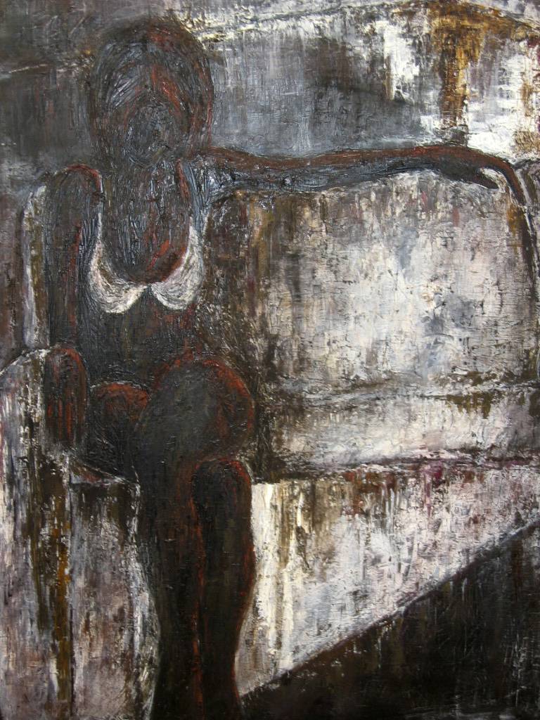Na obrazie widoczna jest postać zanurzona w półmroku, zarysowana ciemnymi, grubymi liniami. Ubrana w kontrastującą biel, siedzi na kanapie, której tekstura wydaje się szorstka, niemal jakby można było ją poczuć pod palcami. Kolory są stonowane, dominują brązy, szarości i czerń, co nadaje dziełu melancholijny, wręcz przytłaczający nastrój. Kompozycja jest surowa, ale jednocześnie przyciąga wzrok. Wydaje się, że artysta użył techniki impasto, co dodaje głębi i trójwymiarowości obrazu. Uderzająca jest emocjonalna intensywność tej pracy, jakby postać na obrazie miała wiele do powiedzenia, ale milczała. Jest coś deeply haunting w tym, jak ta anonimowa twarz patrzy gdzieś poza horyzont. Dla siedmioletniego dziecka wygląda, jakby ktoś się schował przed światem. Obraz może budzić refleksje nad samotnością lub izolacją, odzwierciedla niepokój, ale jednocześnie jest w tym coś fascynującego. Z każdą chwilą spędzoną na obserwacji, odkrywa się coraz więcej szczegółów, które ciasno oplatają odbiorcę emocjami. Może trochę smutno, ale pięknie, no nie?