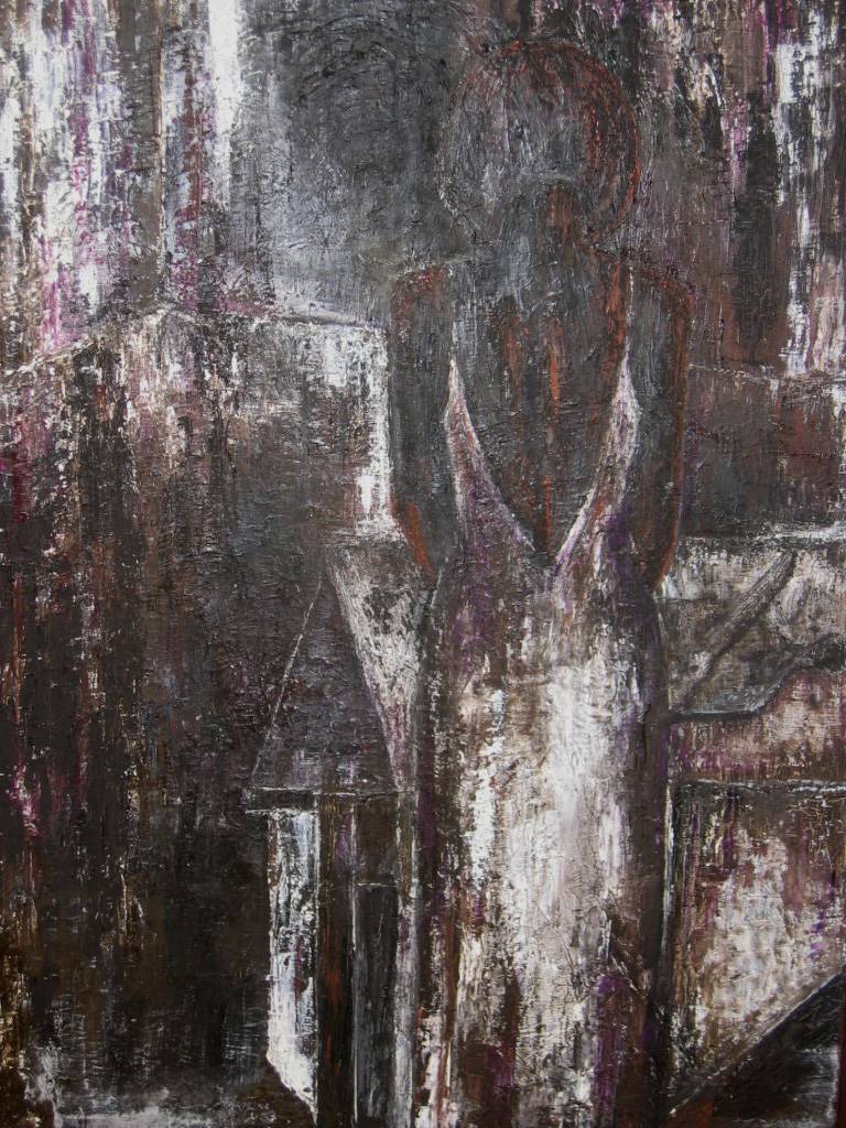 Obraz, który widzimy, jest pełen kontrastów i tajemniczości. Dominują ciemne barwy ziemi, w których przemykają przebłyski bieli i delikatnych fioletów. Postać na pierwszym planie wydaje się odwrócona od nas, zanurzona w myślach przy czymś, co przypomina biurko lub fortepian. Nie mogę się powstrzymać, by nie zastanawiać się, co kryje się w jej głowie. Kompozycja opiera się na pionowych i poziomych liniach, dodając struktury tej abstrakcyjnej scenerii. Artysta zastosował technikę impasto, tworząc grube warstwy farby, które nadają obrazowi fakturę i głębię. Atmosfera dzieła jest spokojna, ale zarazem pełna niepokoju. Czuć jakby coś wisiało w powietrzu, coś niewypowiedzianego. Styl obrazu przypomina nieco ekspresjonizm, z silnym naciskiem na emocje. Użycie ciemnych kolorów i dynamicznych pociągnięć pędzla potęguje nastrój tajemnicy. Obraz może wywoływać różnorodne emocje. Dla mnie to trochę jak zamyślenie w chwilach ciszy, kiedy duszę wypełnia nostalgia. Wow, patrząc na to dzieło, człowiek czuje, że trzeba się zatrzymać i pomyśleć. "Dlaczego ona jest taka smutna?" mogłoby zapytać dziecko. Może scena jest smutna? Ale zaraz... może jest pełna nadziei, bo za zakrętem czeka coś nowego? Patrząc na obraz, przypominam sobie, jak ważne jest, by czasem się zatrzymać. Jest w tym jakaś prawda, którą każdy musi sobie odkryć sam. Czy to nie jest magiczne? Myślę, że to jest właśnie to, co artysta chciał przekazać.