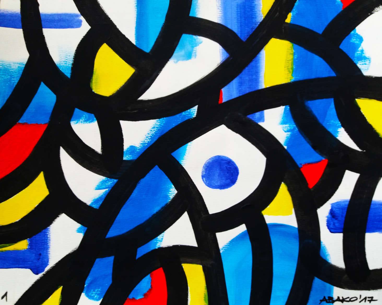 Ten obraz to prawdziwa eksplozja kolorów i kształtów. Intensywne odcienie niebieskiego, żółtego i czerwonego przeplatają się z kontrastującą czernią, tworząc dynamiczną kompozycję pełną energii. Chaotyczna sieć czarnych, grubych linii przywodzi na myśl dziecięce bazgroły, ale jest w nich coś hipnotycznego. Patrząc na ten obraz, czuję się jak w kalejdoskopie marzeń. Styl przypomina mi odważne eksperymenty kolorystyczne z lat 60-tych, trochę jak Mondrian, ale bardziej zwariowany. Obraz emanuje radością i beztroską. Przy pierwszym spojrzeniu może wydawać się bałaganiarski, ale jest w nim jakaś magiczna harmonia. Emocje, jakie wywołuje, to mieszkanka zachwytu nad odwagą artysty i nostalgii za czasami nieskrępowanej kreatywności. Nie da się go zignorować. To jak taniec kolorów z dźwiękiem krzyczących z radości dzieci. Wow, chciałbym tylko wskoczyć tam i dołączyć do zabawy. Jakbym był artystą, pewnie nazwałbym ten obraz "Chaos in harmony", bo te dwa pojęcia idealnie się tu przenikają. Jedno jest pewne: ten obraz przykuwa uwagę i zaprasza do odkrywania go bez końca. Trochę jak zagadka, która nigdy nie zostanie rozwiązana, ale za to nieskończenie fascynująca.
