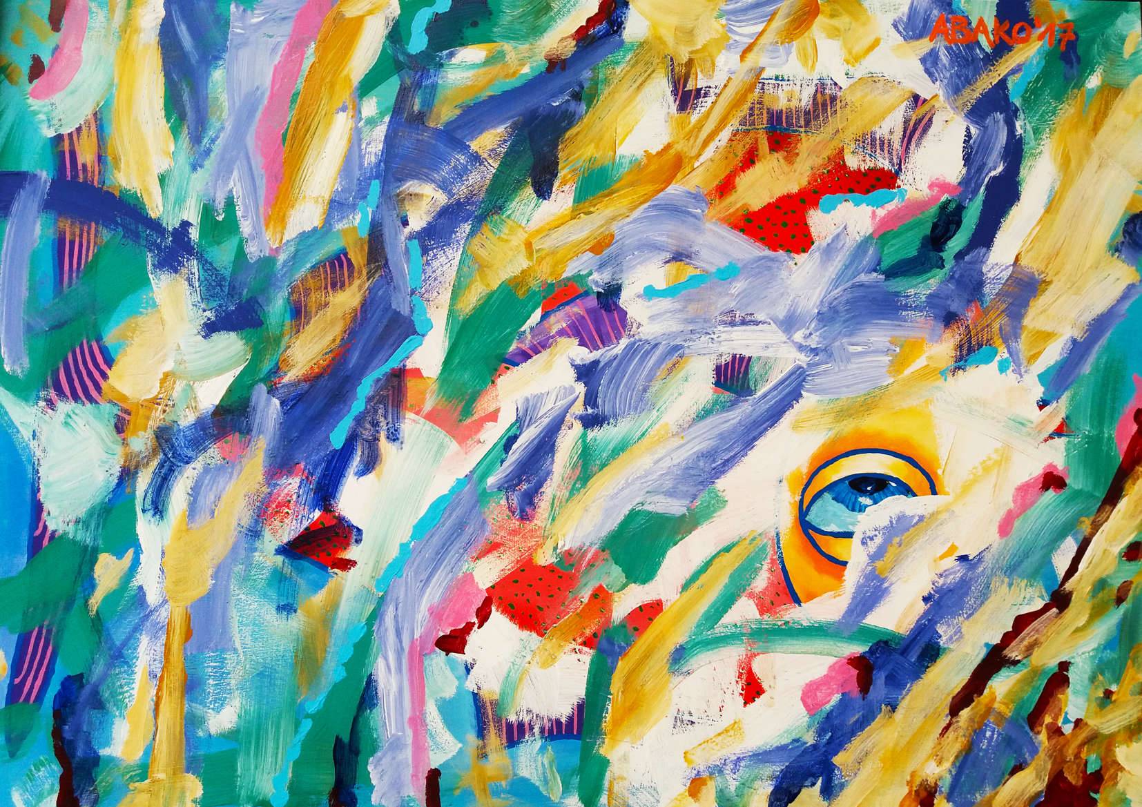 Obraz to prawdziwa feeria barw, gdzie dominują jaskrawe odcienie niebieskiego, zielonego i żółtego, przeplatane z subtelnymi plamami różu i czerwieni. Kształty są dynamiczne, pełne energii, niektóre przypominają chmury na niebie, inne tną przestrzeń niczym kolorowe błyski. Kompozycja jest nieoczywista, swobodna, prowadząca wzrok w nieprzewidywalnym kierunku, prawie jak jazda rollercoasterem. W centrum widnieje tajemnicze oko, które zdaje się obserwować wszystko dookoła — jakby ono było sercem tego artystycznego chaosu. Feeling tego dzieła to czysta radość tworzenia, ale też pewna nostalgia. Można przypuszczać, że artysta użył techniki impasto, nakładając farbę grubymi pociągnięciami pędzla, tworząc trójwymiarowy efekt. Maluszek by powiedział, że wygląda jak bałagan z kolorowych kredek i to cudownie w tym chaosie odnajdywać swoje myśli. Emocje? Mieszanka zaskoczenia i zachwytu. Może to dzieło przypominać sen, który oglądasz zza zamkniętych powiek. A może to po prostu "happy" art.