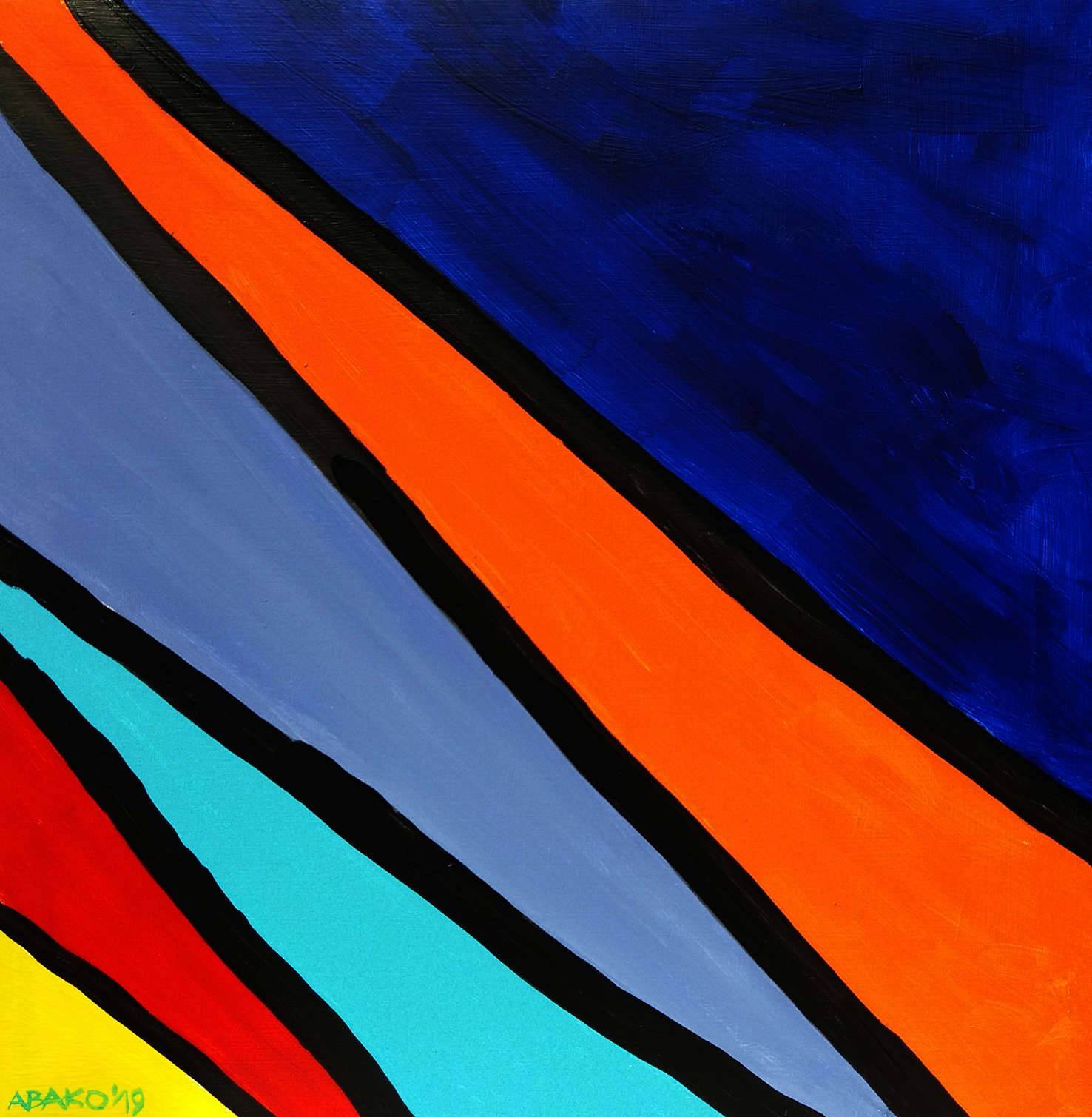 Obraz przedstawia fascynującą grę kolorów i kształtów, które przenikają się w dynamicznej kompozycji. Żywe odcienie niebieskiego, pomarańczowego i czerwonego są przeplatane czarnymi liniami, tworzącymi harmonijne, lecz jednocześnie kontrastowe przejścia. Te pasy kolorów prowadzą wzrok przez płótno, nadając mu energii i witalności. Ale, hej, spójrz na ten błękit! Seriously, uczucie swobody i spontaniczności jest nieodparte. Artysta posługuje się techniką, która przypomina malarstwo ekspresjonistyczne, gdzie intensywność barw jest kluczowa. A jak te kolory się ze sobą bawią! Nastrój dzieła jest pełen radości i optymizmu, emanuje z niego nieskrępowana energia, coś jak letnie popołudnie pełne słońca. Widz może poczuć przypływ pozytywnych emocji lub po prostu zostać porwany przez tę kolorową burzę. Obraz wydaje się mówić "Żyj chwilą!". Dziecko powiedziałoby: "To wygląda jak tęcza na wakacjach!". Dzięki zastosowanej kolorystyce i technice, obraz może budzić różne skojarzenia - od abstrakcyjnych pejzaży po emocjonalne wyrazy artysty. Jest to jak podróż do świata, gdzie kolory snują swoje własne historie, a ty jesteś częścią tej opowieści. מחזרając się na tę wizualną ucztę, można dostrzec, jak każde pociągnięcie pędzla przywodzi na myśl moment, w którym piękno jest uchwycone w swojej najczystszej formie.