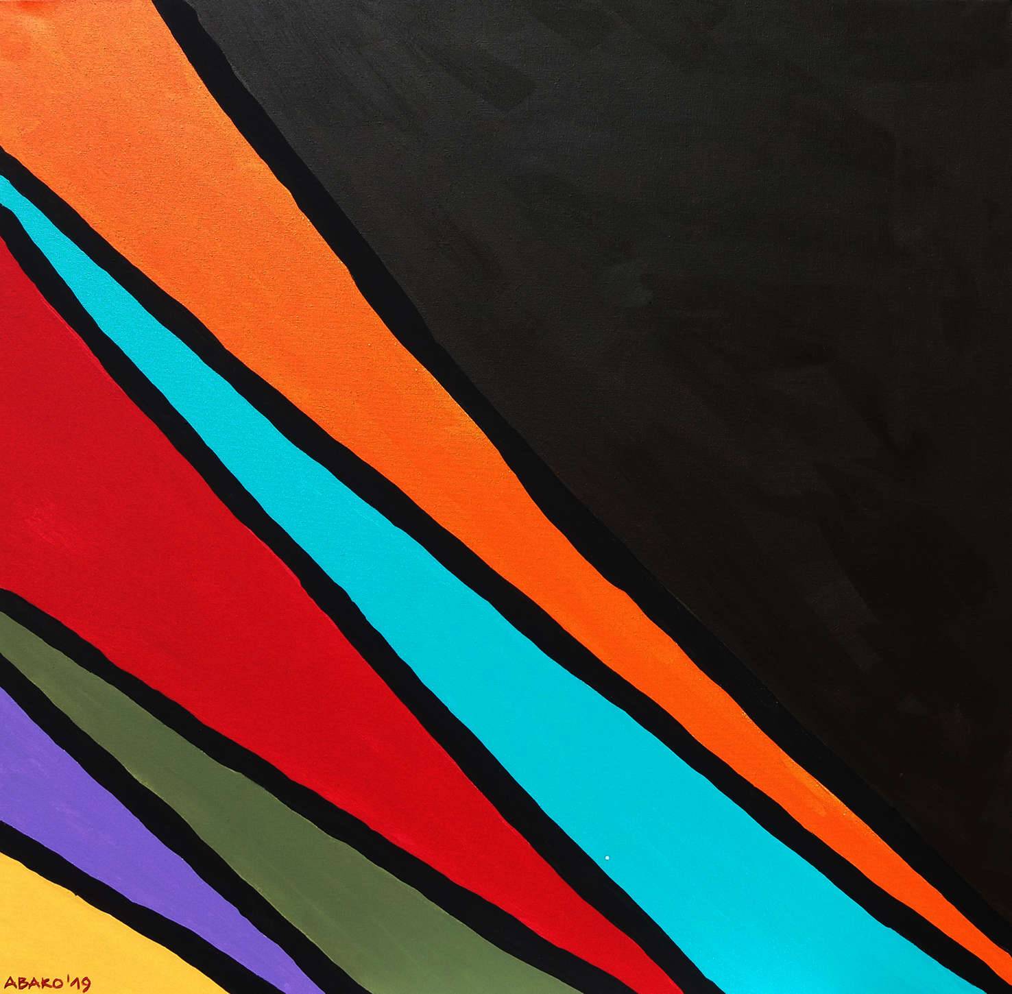 Obraz emanuje energią, pełną krzykliwych kolorów i kontrastów. Pasma kolorów, począwszy od jaskrawej czerwieni, przechodząc przez elektryczny niebieski, intensywną zieleń i pomarańczowy, tworzą dynamiczną kompozycję. Czarny, matowy trójkąt przygniata z jednej strony, dając wrażenie, jakby kolory chciały się spod niego wyrwać. Całość niesie ze sobą atmosferę napięcia, jak chwila przed burzą, ale też radości. To trochę jak sytuacja, kiedy wszystkie kolory świata spotkały się na jednej kartce i postanowiły urządzić festiwal. Artysta zastosował prostą technikę plam barwnych, lecz zrobił to z rozmachem, który potrafi porwać uwagę na dłużej. Brak skomplikowanych wzorów daje poczucie, że istotne jest coś więcej, niż tylko forma. Kolory są jak dziecięce kredki, które bez ładu i składu zostawiają na papierze ślady emocji. Widząc to, mogę powiedzieć wow! Obraz uruchamia w odbiorcy lawinę uczuć. Może wywołać zarówno zachwyt nad prostotą, jak i zaskoczenie nad intensywnością. Ten mix kolorów to jak impreza, która nigdy się nie kończy; raz w kolorze, a raz w czerni. Ciekawe, ile różnych osób widząc to dzieło pomyślało: "Hey, that's awesome!" To sztuka, która mówi sama za siebie, nie potrzeba słów.