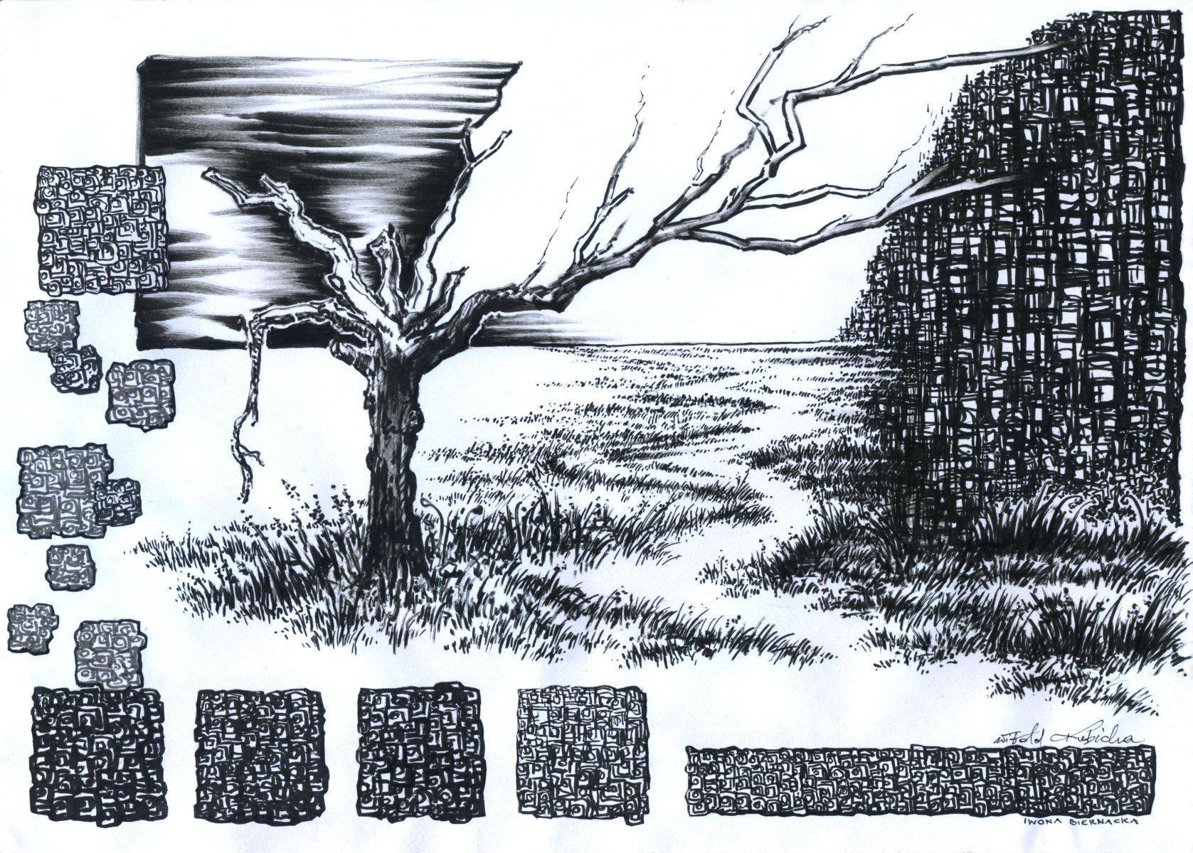 Rysunek pod tytułem - Nostalgia 21 x 29,7 cm. Technika mieszana. Oryginał. Podpisany. Sprzedawany bez oprawy Ewentualne niewielkie różnice w kolorach zdjęcia i oryginału mogą wynikać z ustawień monitora. I co najważniejsze...rysunek powstał w wyniku pracy dwojga artystów - Witolda Kubichy i Iwony Biernackiej - przy realizacji wspólnego projektu zatytułowanego ?!. Każdy z rysunków tego projektu rysowany był przez nas oboje. Jedna osoba rozpoczynała pracę, a następnie przekazywała drugiej do kontynuacji. Jeśli uznaliśmy, że to słuszne - rysunkiem wymienialiśmy się kilka razy, aż do zadowalającego nas finału. Powstało w ten sposób ponad 20 rysunków, które zostały zaprezentowane na wystawie w Centrum Informacji Turystycznej w Nowym Sączu. Zabaw z tuszem, które w tym przypadku można by nazwać ilustracjami do naszej wyobraźni, nie traktowaliśmy w przesadnie poważny sposób, co do tematyki i opowiedzianej treści, nie ma też wiodącego tematu, ani pojedynczego literackiego dzieła, które było bezpośrednią inspiracją twórczych działań. Większość prac projektu ma ilustracyjno-groteskowy charakter. Poważnie staraliśmy się podejść do warstwy formalnej, aby spod używanych przez nas narzędzi rysunkowych nie wyszły rzeczy niedojrzałe. Wspólna praca i wystawa mają jeszcze jeden ważny wymiar. Współczesny system kształcenia artystycznego (Iwona Biernacka - absolwentka Liceum Plastycznego w Nowym Wiśniczu, Witold Kubicha - absolwent Wydziału Grafiki ASP w Krakowie) generuje artystów samotników, nie potrafiących na niwie artystycznej współpracować. Przesłanie naszej wspólnej pracy i wspólnej wystawy jest takie, że mimo wyraźnych różnic w poglądach, również na sprawy ważne, można (i trzeba) współpracować, gdy podjęte dzieło jest dobre, a wymiar całości działań twórczy. Ponieważ na każdej pracy widnieją dwa podpisy, więc pomyśleliśmy o uspokojeniu tych z pośród nabywców, którzy mieliby wątpliwość związaną z nabyciem u jednej osoby rysunku, przy którym pracowały dwie osoby. W moim posiadaniu, znajduje się pismo (do wglądu na miejscu) z własnoręcznym podpisem Iwony Biernackiej potwierdzające jej zgodę na sprzedaż wszystkich prac projektu "?!" przeze mnie w dowolny wygodny dla mnie sposób. Linki zewnętrzne do opisu projektu - to np.: 1. http://www.nowysacz.pl/komunikaty-biura-prasowego/17485 2. http://www.dts24.pl/o-dwojgu-takich-co-rysowali-razem-wystawa-iwony-biernackiej-i-witolda-kubicha/ 3. http://www.dts24.pl/artystyczny-tandem-iwona-biernacka-i-witold-kubicha/