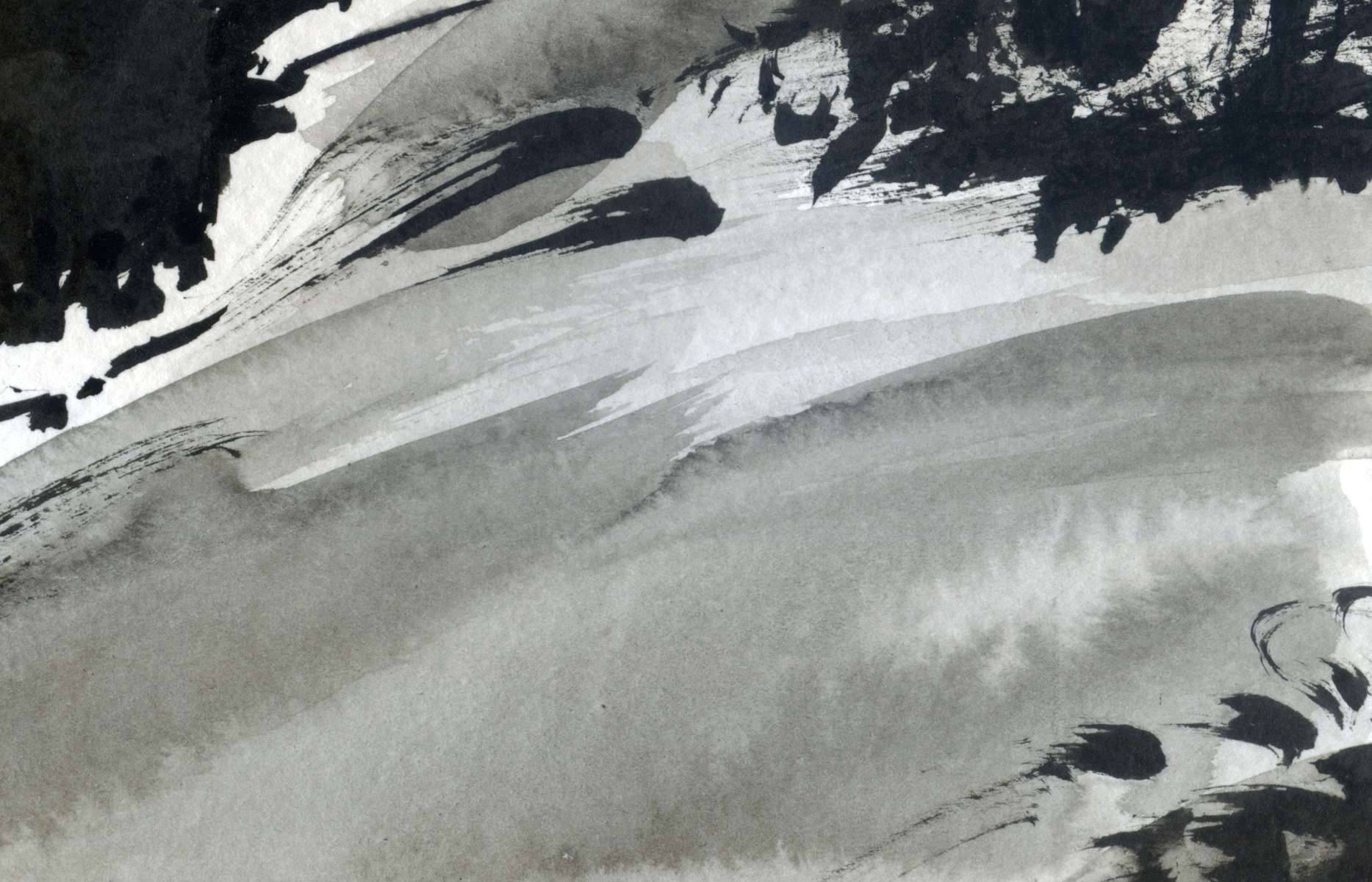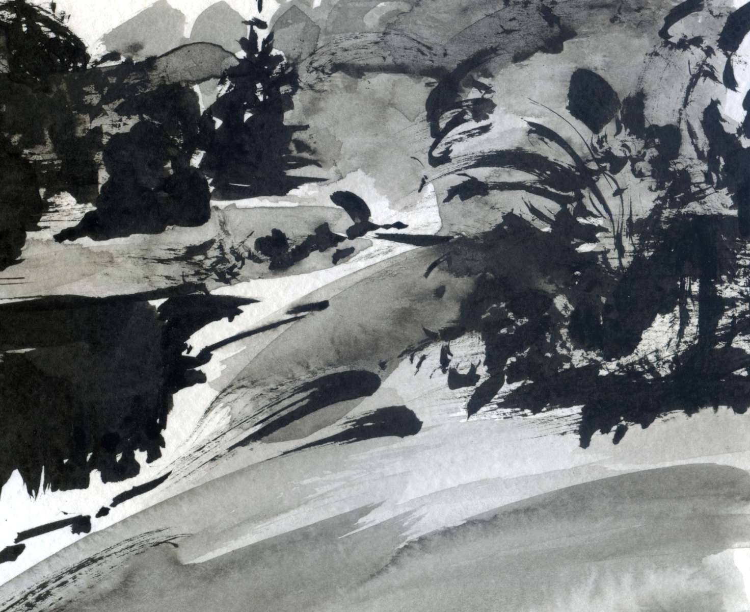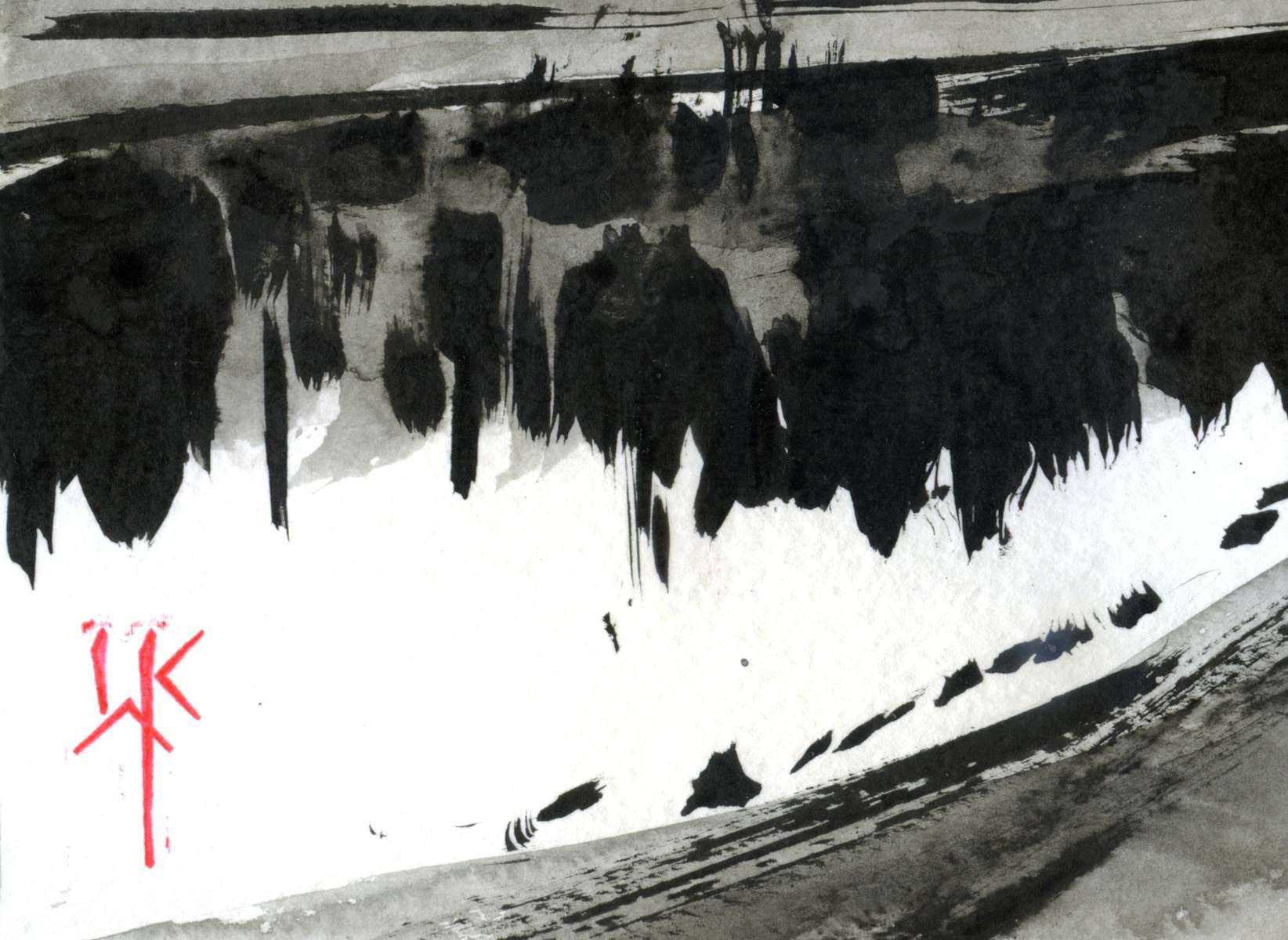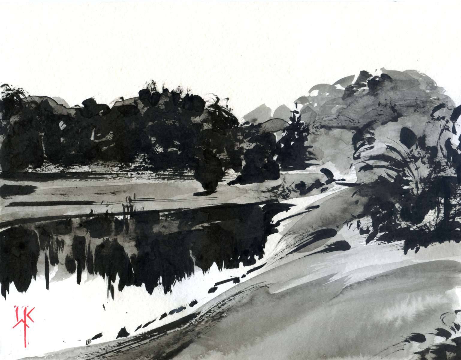 Krajobraz, pejzaż. Wykonany w estetyce wschodniej. Sumi-e. Tusz na papierze akwarelowym. 30 x 20 cm. Oryginał. Opieczętowany monogramem, którego używam gdy mój obraz nawiązuje do estetyki Dalekiego Wschodu.