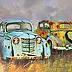 Na obrazie widzimy dwa stare samochody, które zdają się opuszczone na tle malowniczego pejzażu. Pierwszy z nich, w odcieniu pastelowego błękitu, emanuje nostalgią, podczas gdy drugi, w zardzewiałej czerwieni, przypomina o przemijaniu czasu. Łagodne, stonowane kolory nieba tworzą spokojną i refleksyjną atmosferę. Kompozycja jest dynamiczna, a rozmieszczenie pojazdów zachęca do wędrówki wzroku po płótnie. Technika artystyczna, z wyraźnymi pociągnięciami pędzla i subtelnymi przejściami kolorów, dodaje obrazu impresjonistycznego „touch”. Ta swobodna forma malarska podkreśla ulotność chwili, jakby auta zaraz miały rozpłynąć się w otoczeniu. Obraz wywołuje emocje tęsknoty za minionymi czasami, może skłaniać do zastanowienia się nad historią tych samochodów. Patrząc na ten obraz czuję, jakby czas stanął w miejscu. W jakiś sposób jest to comforting, przypomina o rzeczach niezmiennych mimo upływających lat. "O, patrz, takie auto jak dziadek miał!" – może powiedzieć 7-latek, widząc te zabytkowe pojazdy. Dzieło to jest jak zatrzymany moment między przeszłością a teraźniejszością, a ja tylko mogę się domyślać wszystkich jego historii.