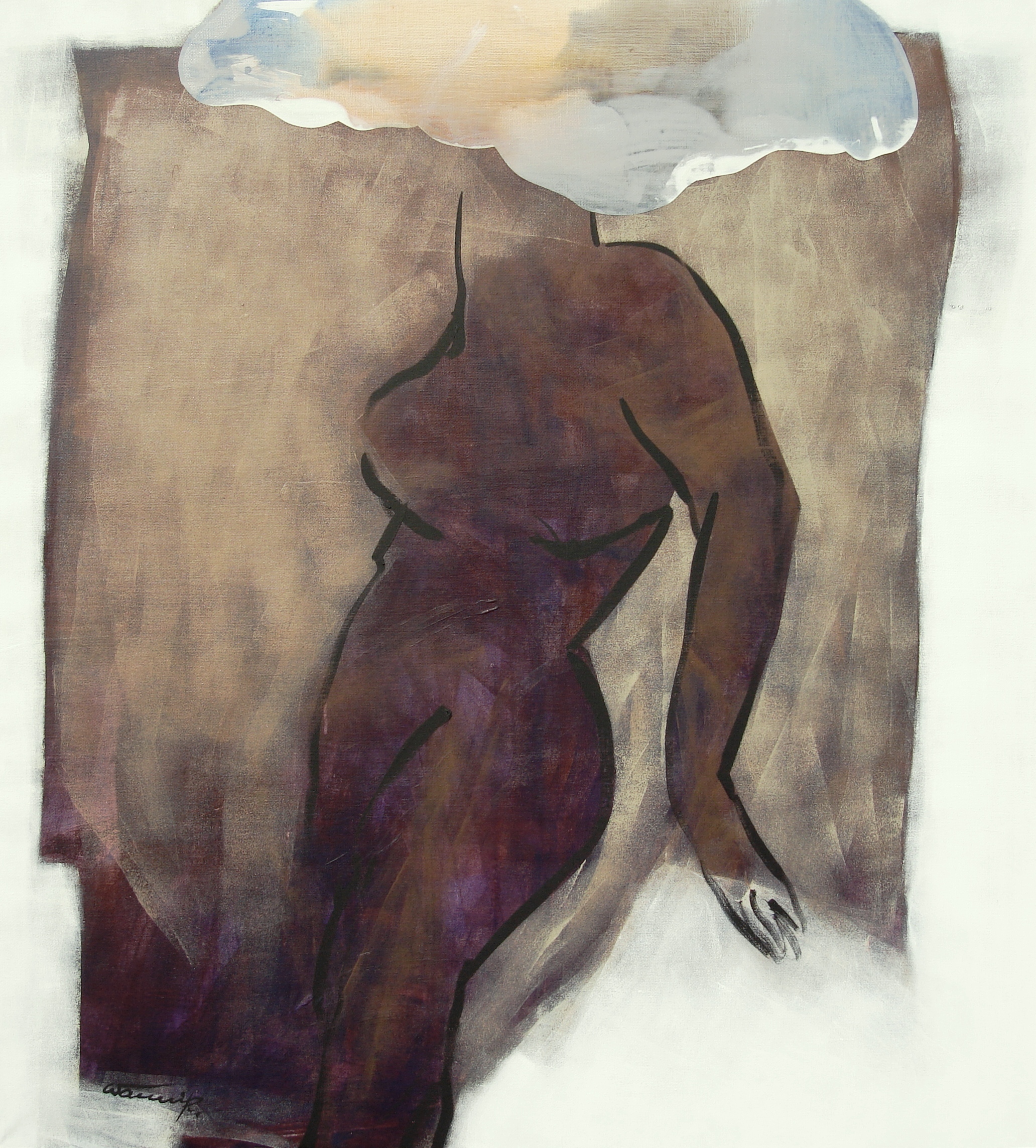 ZACHMURZONA, obraz sygnowany nazwiskiem autora z przodu i z tyłu, powstał w 2022 r. Na obrazie widzimy sylwetkę kobiety o organicznych kształtach, której głowa jest zastąpiona chmurą. Ciepłe odcienie brązu i beżu dominują w pionowej kompozycji, kontrastując z jasną chmurą nad sylwetką. Technika malarska jest miękka, z rozmytymi krawędziami, dodającymi tajemniczości. To takie airy-fairy, jakby postać dryfowała między światem a niebem. Utrzymana w spokojnej, nieco nostalgicznej atmosferze, praca wywołuje poczucie zagubienia, a jednocześnie swobody. "Chciałabym mieć chmurkę zamiast głowy", powiedziałoby dziecko. Artysta zastosował minimalistyczne podejście, podkreślając elegancję poprzez prostotę linii. Obraz może budzić refleksje na temat ludzkich myśli, ulotności marzeń i tęsknoty za wolnością. To jak zagadka, która kusi, by ją rozwiązać, ale może lepiej zostawić ją niewyjaśnioną. Przyglądam się temu dziełu i czuję, jakbym unosił się wraz z tą eteryczną postacią, zaglądając do świata marzeń.