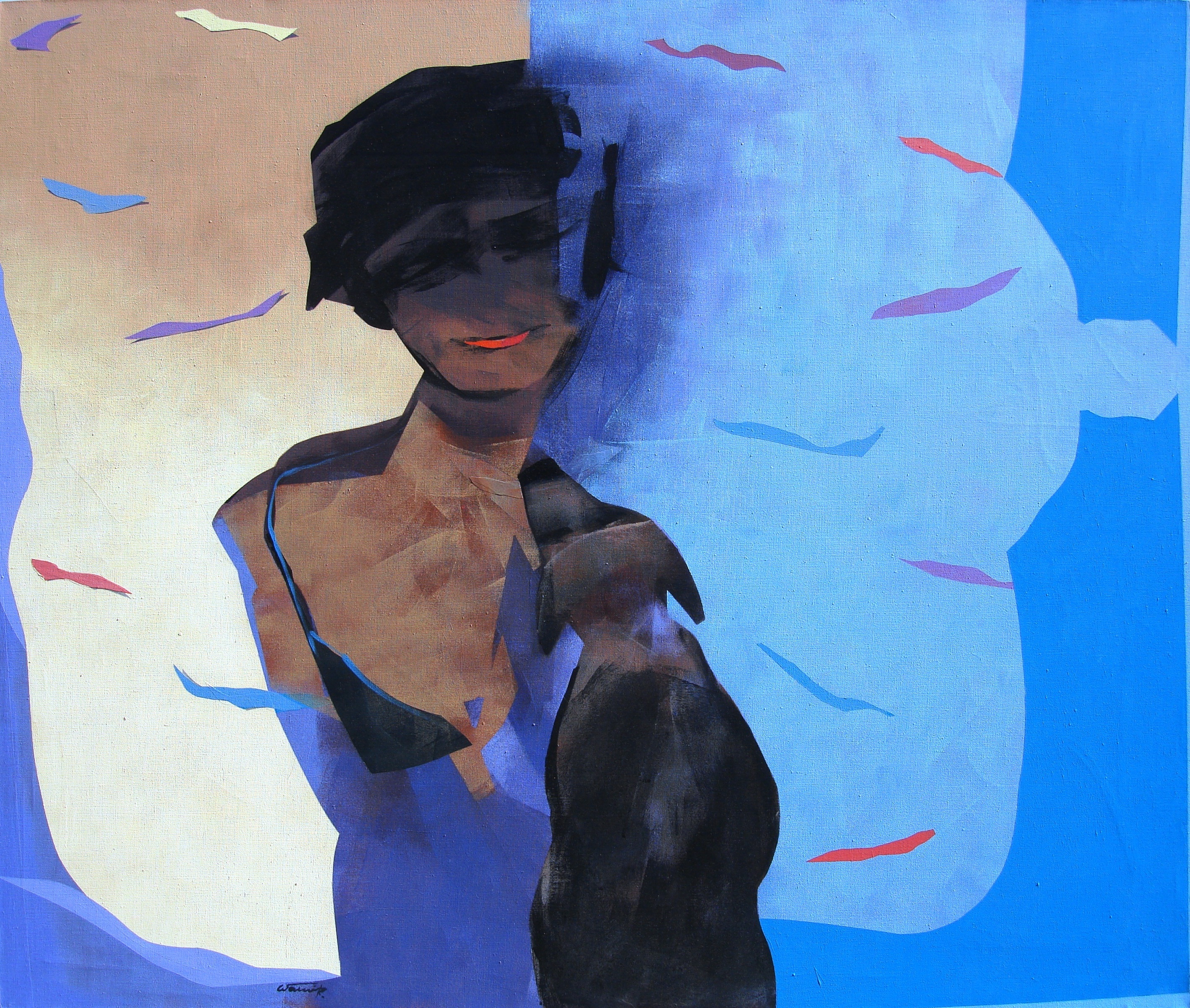 CAŁUSKI akryl 110 x130 cm. 2023 r. Obraz przepełniony jest delikatnymi odcieniami niebieskiego i beżu, które artysta zręcznie splata, tworząc tajemniczą, choć intymną kompozycję. Wyraźne kontury, sylwetki kobiety i psa stają się centralnym punktem dzieła, przyciągając wzrok swoimi geometrycznymi kształtami. Wydaje się, że postacie wyłaniają się z tła, jakby chciały opowiedzieć swoją historię. Ciepłe, subtelne światło dodaje harmonii i spokoju, ale równocześnie wywołuje lekkie dreszcze emocji. Czy to postacie z marzeń sennych? Czy może wspomnienie? Styl artysty przejawia się w miękkich pociągnięciach pędzla i dynamicznej grze kolorów. Malarz bawi się formą, stosując collage-like techniques do stworzenia poczucia głębi i ruchu. Każdy widz może zobaczyć coś innego, co jest przecież magiczne. Jakaś niespotykana więź łączy nas z obrazem. Obraz emanuje tajemniczością. Jest trochę jak zagadka do rozwiązania. Dla mnie to wygląda jak senne marzenie. Patrząc, można mieć wrażenie jakby czas zwalniał, jakby każda chwila była zawieszona w przestrzeni. Naprawdę, to uderza do głowy. Inny świat, inna rzeczywistość.