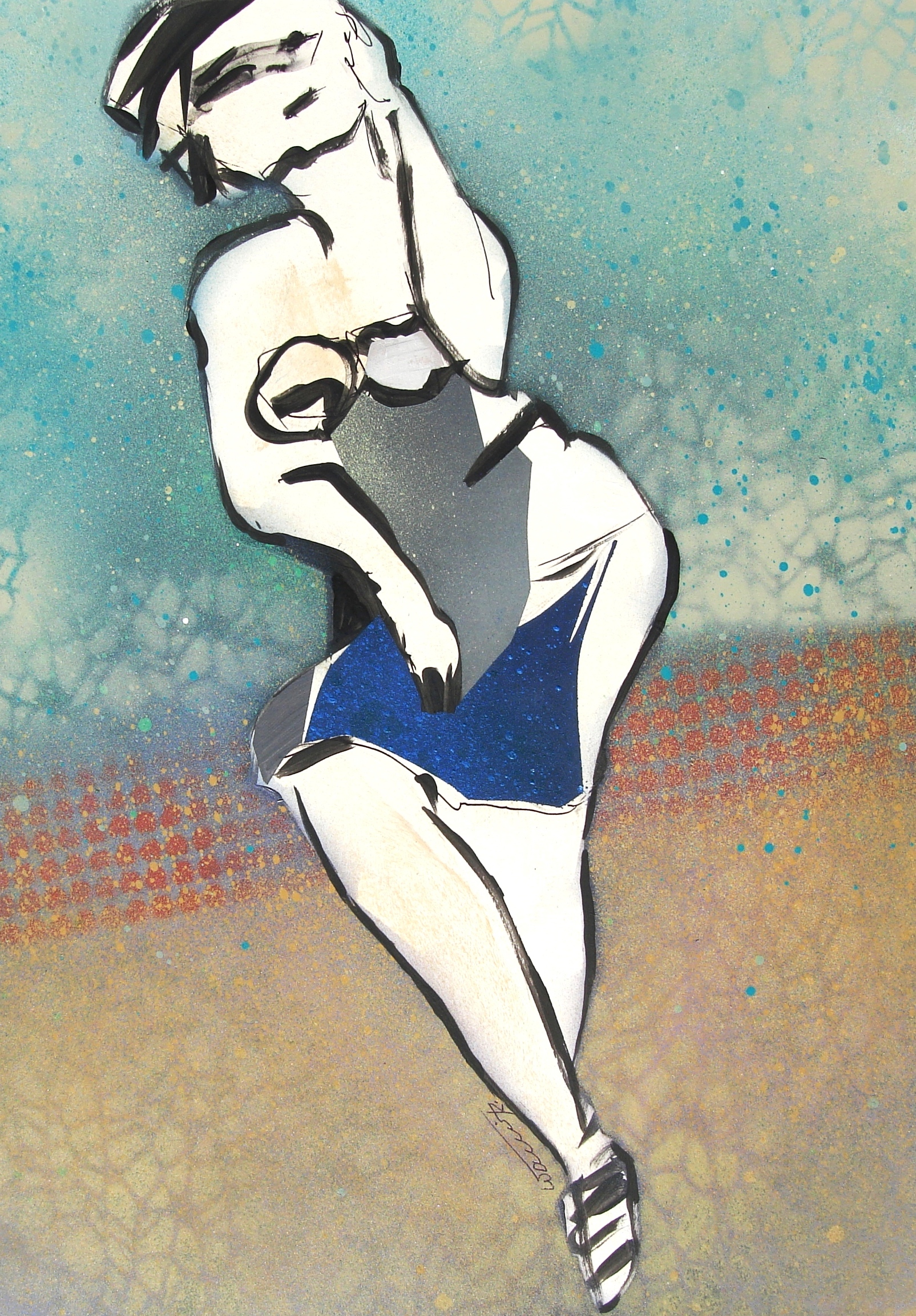 Na obrazie dominuje postać kobiety, która przyciąga wzrok swoją intrygującą kompozycją. Jej sylwetka jest jakby odręcznie szkicowana, z wyraźnymi, czarnymi konturami kontrastującymi z delikatnym błękitem tła. Kolory to mieszanka intensywnego niebieskiego, przechodzącego w miękką pastelową paletę. Styl obrazu jest nieco abstrakcyjny, z elementami, które sugerują surrealizm. Atmosfera wydaje się być lekka, a jednocześnie nieco melancholijna. Moja siostra mówi, że wygląda jak wróżka z bajki! Technika malarska przypomina grafitti, z wyraźnymi śladami pędzla i rozprysków. Emocje? Trochę nostalgii zmieszanej z odrobiną spokoju. Kompozycja przyciąga uwagę ekspresją i swobodą formy, której niedoskonałość dodaje uroku. Obraz może wywoływać refleksję nad dzisiejszym życiem, w którym piękno i chaos często się przenikają. Jest coś magicznego w tej interpretacji świata pełnego możliwości. Obraz namalowany farbami akrylowymi na kartonie. Całość oprawiona w ramkę koloru srebrnego i białe passe-partout o wym. 50,0 x 40,0 cm.