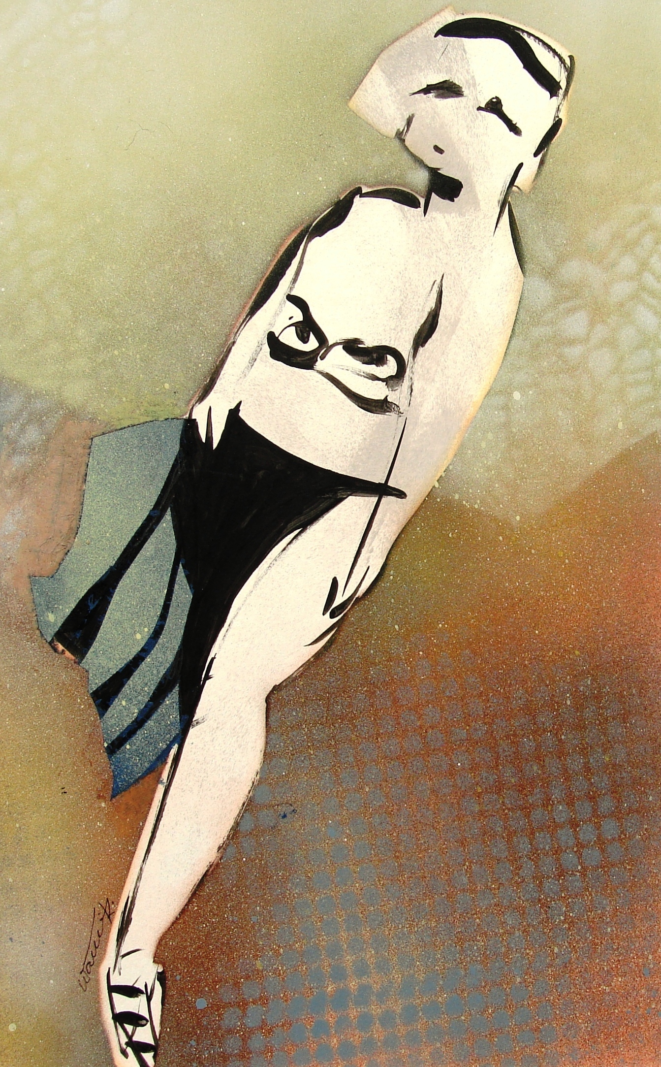 Obraz ten emanuje dynamiczną energią przez abstrakcyjną kompozycję postaci, która jakby unosi się w przestrzeni. Dominują delikatne odcienie beżu i brązu, które nadają całości przyjemny dla oka kontrast z ostrymi czerniami i bielami detali. Postać jest zarysowana prostymi, lecz zdecydowanymi liniami, przypominającymi szybkie szkice rysunkowe. Twarz jest schematyczna, zagadkowa, z oczami, które zdają się wpatrywać obserwatora, budząc niepokój i ciekawość. Obraz wywołuje mieszane uczucia. Z jednej strony eksplozję energii i swobody, z drugiej zaś intryguje niezrozumialością. Dla mnie, to kolejka górska emocji. Ten „styl” nawiązuje do nowoczesnej sztuki, co sprawia, że jest tak „cool”. Można go odczytywać wielorako, każdemu pozwala na odkrycie własnych znaczeń i emocji. Myślę, że to fajne, bo każdy może widzieć w nim co innego. Obraz namalowany farbami akrylowymi na kartonie. Całość oprawiona w białe passe-partout i czarną ramkę o wym. 50,0 x 40,0 cm.