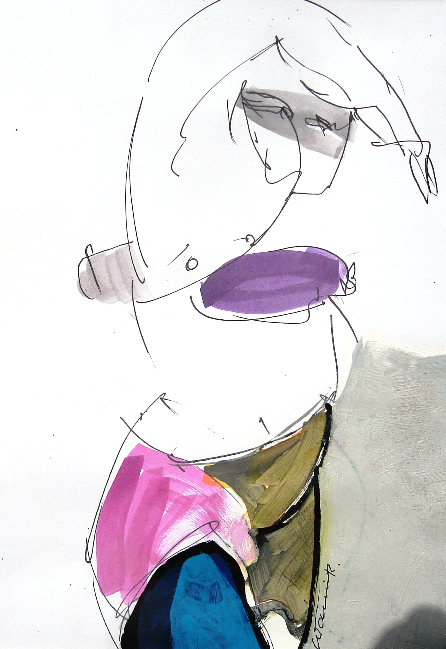 Gest, ruch, swobodna kreska prowadzenia konturów, delikatność i światło - to cechy tej pracy. Praca oprawiona w szare passe-partout i czarną ramkę o wym. 50,0 x 40,p cm.