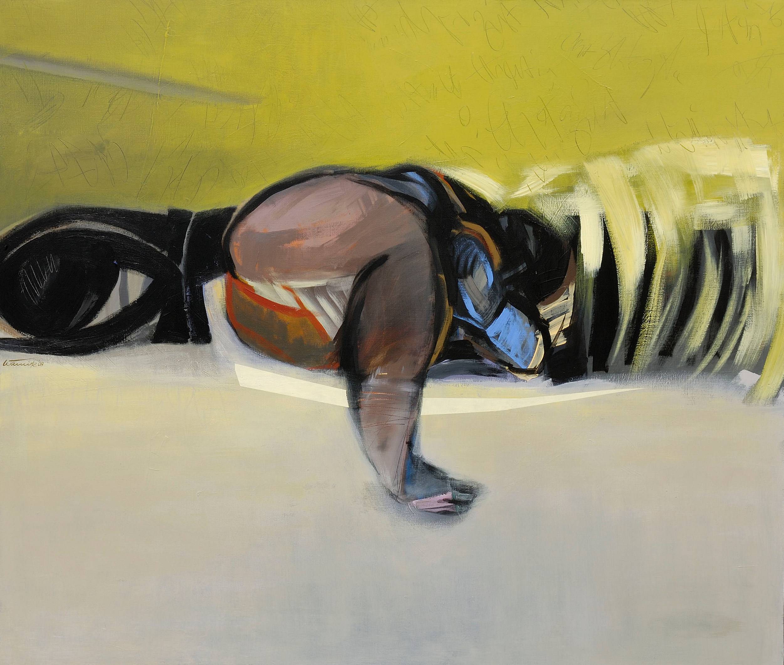 ŚPIACA, obraz sygnowany nazwiskiem autora z przodu i z tyłu, powstał w 2008 r. Nigdy nie mam pewności co do jej snu i przebudzenia. O świcie przechyla lekko głowę, dłonią dotyka sufitu. Zakłada nogę na nogę, zasypiając. Takie przyzwyczajenie z obaw przed nocnym pożądaniem nieświadomym. Magiczne kołdry i wielkie poduszki niczym pola i stawy, nad którymi można odejść w zapomnienie. Zawsze jest tylko trochę, tylko na chwilę, tylko tutaj i tam jednocześnie, nigdy na pewno. Wiem o niej wszystko, bo z nią zasypiam. Noc. - tekst napisała Kamila Rondo. Przedstawiona w tym obrazie postać kobiety samotnie odpoczywającej, to często występujący temat w twórczości Włodka Warulika. Praca oprawiona w czarną taśmę - gurt. Obraz zawerniksowany matowym werniksem, sygnowany z przodu i z tyłu monogramem artysty/ Warulik. Praca może wnieść pozytywną energię i ożywić każdy rodzaj wnętrza. Może być miłym prezentem dla ceniących nowoczesność i dynamikę. Obraz oprawiony w czarną taśmę - gurt.