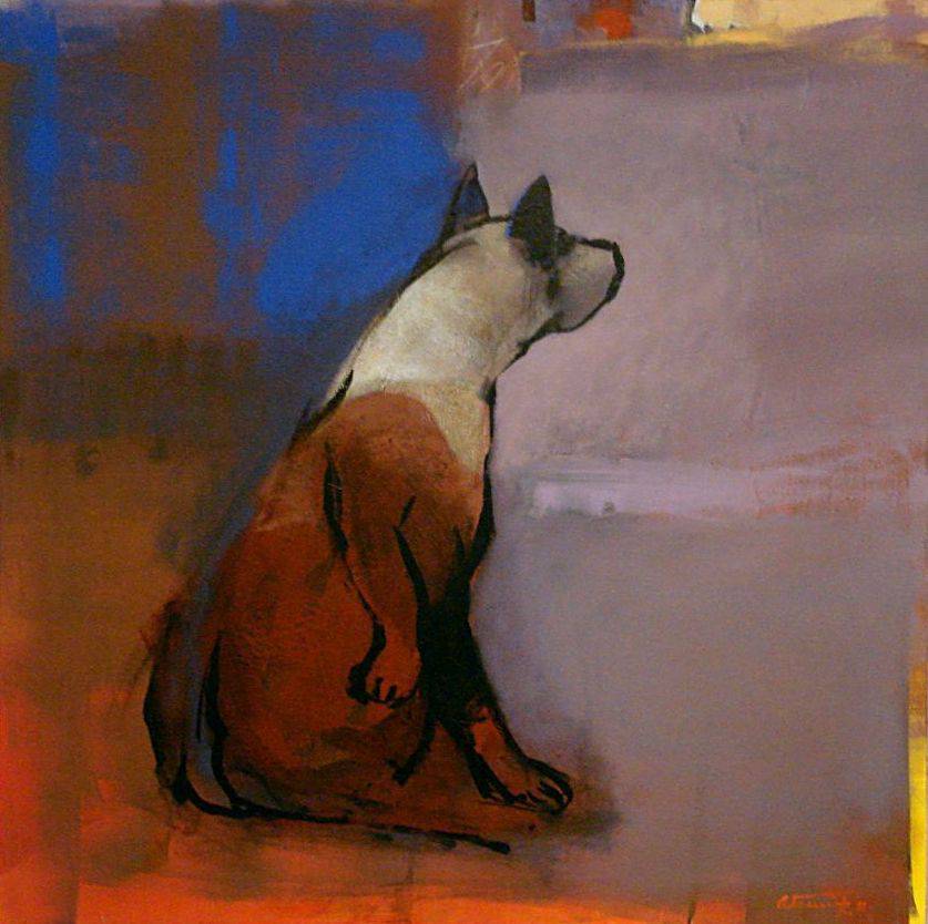 Na obrazie dominuje pies siedzący dumnie, skierowany w prawą stronę. Jego sylwetka jest wyrazista, zakreślona czarnymi konturami, które kontrastują z resztą dzieła. W tle mamy chaos barw - głównie ciepłe brązy i chłodne błękity przechodzące w szarości. Całość kompozycji, choć prosta, zniewala harmonią i spokojem. Widz mógłby pomyśleć, że pies obserwuje coś fascynującego, coś, co pozostałe dzieła świata nigdy nie uchwycą. Atmosfera jest melancholijna, ale z nutką nadziei. Tak, jakby artysta chciał powiedzieć: "Zatrzymaj się, spójrz, zatrzymaj chwilę". Styl artysty jest dość ekspresyjny, widać tu wpływy abstrakcjonizmu. Technika użycia kolorów tworzy wrażenie głębokości i tajemniczości. Na dziecięcy sposób: piesek wygląda jakby szukał przyjacióła. Emocje kłębią się w odbiorcy, może poczuć nostalgię za czymś utraconym. Jednocześnie, obraz może być jak "window to the soul", odkrywając nie tylko psa, ale i nas samych. Refleksyjny moment, kiedy patrzysz na ten obraz, pozostaje w myśli na długo.