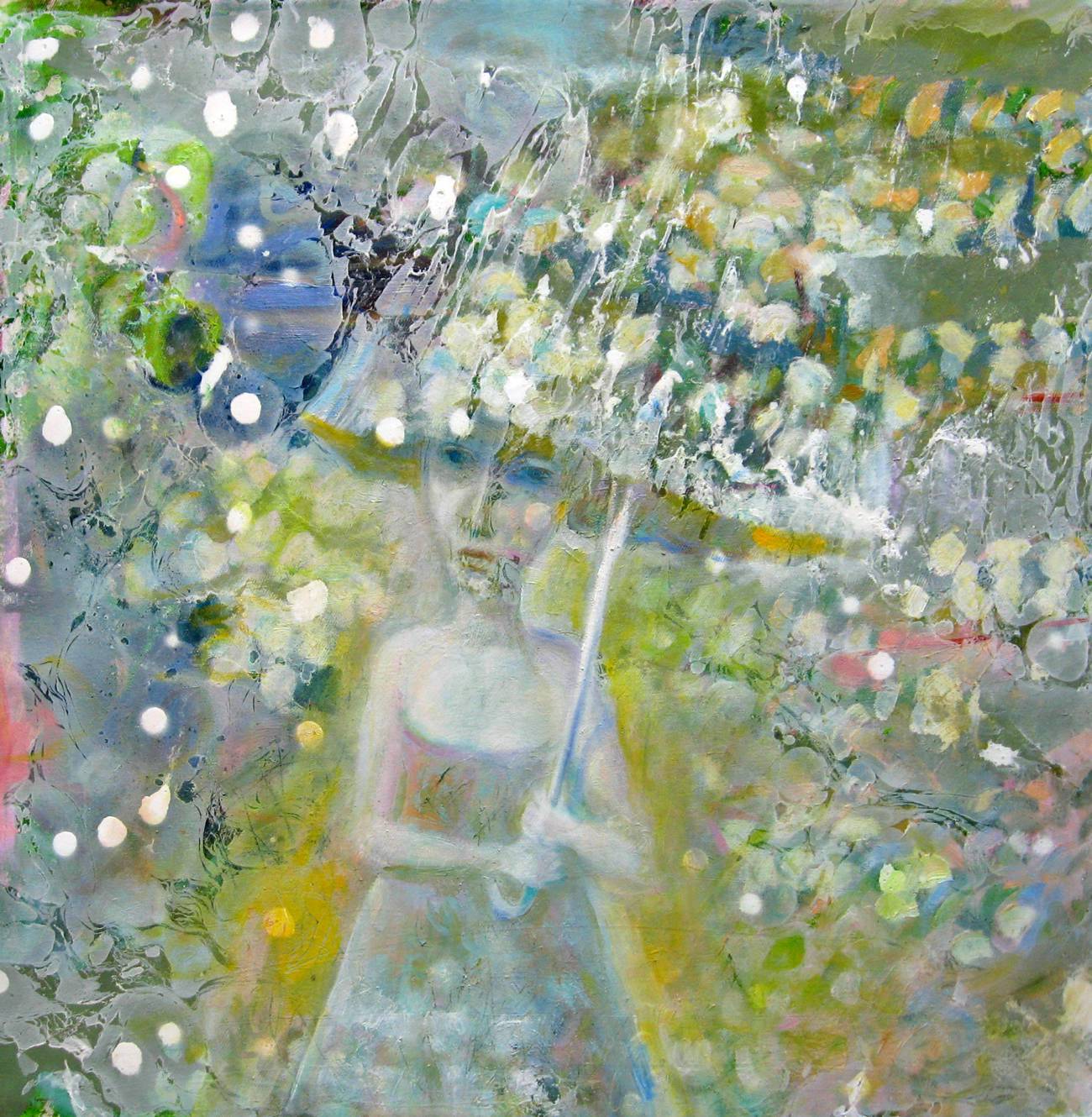 Obraz przyciąga wzrok pastelowymi kolorami, które jakby tańczą po całej powierzchni dzieła. Dominuje delikatna zieleń, błękit i ciepłe odcienie żółci, które splatają się w subtelny kalejdoskop emocji. Postać trzymająca parasol zdaje się być zamglona, jakby patrzyła na nas zza szyby pokrytej kroplami deszczu. Atmosfera jest eteryczna, niemalże magiczna, niczym scena z bajki, w której czas stanął w miejscu. Technika użyta przez artystę zdaje się być kolażem lekkości i impresjonistycznej niedopowiedzianej narracji. Można prawie usłyszeć szept wiatru w liściach i miękkie, ciche spadanie kropel deszczu. Obraz niesie ze sobą echo melancholii oraz dziecięcej radości jednocześnie. Pasuje tu idealnie zdanie „Lubię deszcz, bo można skakać po kałużach!” Odbiorca może odnaleźć w nim wspomnienia letnich popołudni spędzonych na beztroskiej zabawie, ale także chwile zadumy i refleksji. Czujesz tę lekkość, almost like floating. Każdy dotknięty pędzlem szczegół opowiada własną, unikalną historię. Ten obraz to prawdziwy taniec myśli i uczuć, który potrafi poruszyć niejeden zmysł.