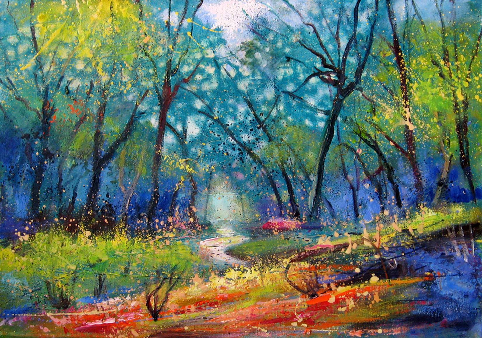 Na tym obrazie widzimy pełen życia krajobraz leśny, który zachwyca swoją barwną paletą. Dominujące odcienie zieleni i błękitu tworzą tło lasu, podczas gdy jasne czerwienie i żółcie dodają energii. Kształty drzew są dynamiczne, przypominają wirujące i splątane gałęzie, które rozciągają się ku górze. Kompozycja obrazu prowadzi oko odbiorcy w głąb ścieżki, która znikąd się pojawia i prowadzi w nieznane. Atmosfera jest pełna tajemnicy i ekscytacji, trochę jak w magicznej bajce, gdzie wszystko jest możliwe. Można niemal poczuć na twarzy podmuch wiatru i usłyszeć szum drzew. Styl obrazu jest swobodny, używa technik akwarelowych, prawdopodobnie połączonych z techniką nakrapiania, co dodaje tekstury i głębi. Obraz wywołuje uczucie spokoju, ale jednocześnie wyzwala chęć odkrywania. Jestem pewny, że każdy, kto na niego patrzy, może poczuć się jak odkrywca. Mogło by to być thrilling experience! Dla mnie, ten obraz to zaproszenie do świata fantazji, gdzie każda ścieżka prowadzi do nowej przygody. Małe dziecko mogłoby powiedzieć: "Tam jest zaczarowany las, gdzie żyją wróżki!" Taki obraz z pewnością zatrzymuje widza na dłużej, pobudzając wyobraźnię i serce.