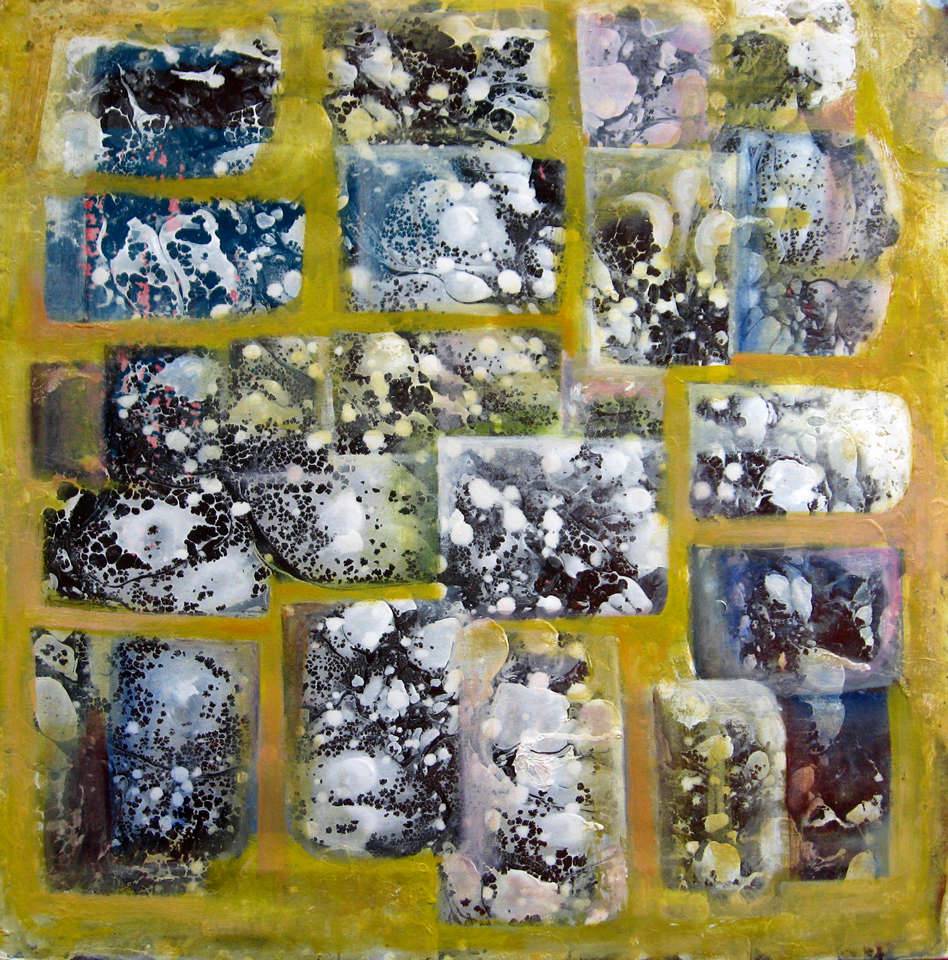 Obraz przypomina kolorowy patchwork, złożony z prostokątów o różnorodnych wzorach i barwach. Dominuje żółć niczym ciepłe tło, które spaja ten kalejdoskop form i kolorów. Prostokąty wypełniają przestrzeń w sposób nieco chaotyczny, ale jednocześnie nie można oderwać od nich wzroku. Niektóre są pokryte białymi plamami na ciemnym tle, przypominającym nocne niebo pełne gwiazd, inne zaś mają subtelne odcienie niebieskiego i różu. Całość emanuje energią i tajemniczością. Technika zdaje się być mieszaniną akrylowych farb z elementami nakrapiania – co nadaje efekt dynamicznej tekstury. Obraz przywołuje momenty niepewności, jakby człowiek znalazł się w labiryncie, gdzie każdy zakręt jest nieprzewidywalny. To małe puzzle, które składają się na coś większego. Ciekawe, co autor miał na myśli? "Lubię kolory, są jak cukierki!" - mogłoby powiedzieć dziecko. Dzieło to jest jak "exploration" nieodkrytych zakątków naszej wyobraźni, gdzie każdy prostokąt to osobna historia do odkrycia. Przyglądając się mu, można poczuć jakby serce biło trochę szybciej z ekscytacji i zadziwienia, co także jest zasługą tej wyrazistej, choć kontrolowanej kompozycji.