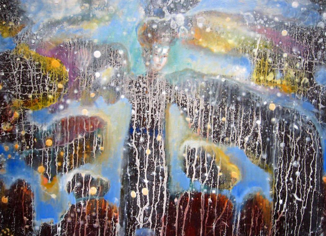 Obraz emanuje tajemniczym urokiem, jak sen, w którym każdy szczegół wydaje się być na krawędzi zapomnienia. Kolory – pastelowe błękity, różne odcienie pomarańczowego oraz czernie i biele – tworzą subtelną, lecz pełną życia paletę. Struktury kompozycji są dynamiczne, z swobodnymi liniami przeplatającymi się i tworzącymi iluzję ruchu. A w samym centrum wyłania się postać, niemalże zjawa, której wygląd jest tak nienamacalny, jak chmura. Atmosfera obrazu jest mistyczna. Artysta zastosował technikę drippingu, co nadaje dziełu spontaniczności i chaosu. Aż chce się zastanowić, co ukrywa się za mgiełką i kroplami farby. Może po prostu to, co kryje nasza podświadomość? Albo coś jeszcze bardziej ulotnego. To obraz, który zmusza do refleksji nad granicą między snem a jawą. Jak patrzę na to, czuję coś dziwnego, jakby świat był niewyraźny, ale jednak magiczny. Czasem, jak się przyjrzymy, odkrywamy jak błyszczy ukryty „shine” w codzienności.