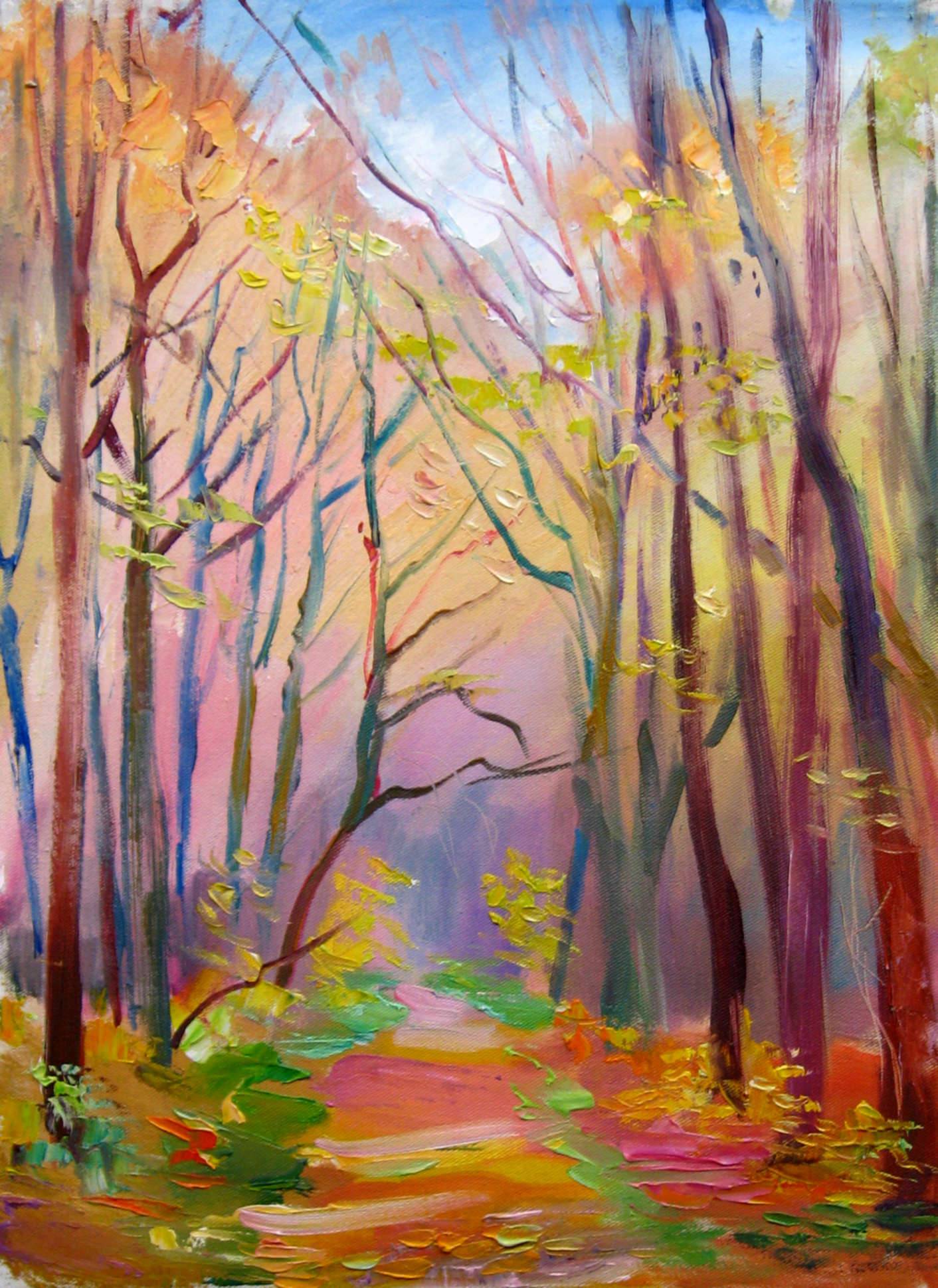 O wow, jaki to piękny obraz. Przedstawia las w genialnych, ciepłych barwach. Wyżłobione pociągnięciami pędzla drzewa unoszą się wysoko nad ziemią, liście mienią się odcieniami zieleni, żółci i różu. Kolory są tutaj żywe, radosne, jakby malarz wrzucił wszystkie farby, jakie miał pod ręką. Ścieżka wijąca się między drzewami zaprasza do spaceru, a tło z domieszką błękitu i pomarańczy tworzy niezwykły kontrast. Atmosfera tego obrazu jest wręcz magiczna – spokojna i jednocześnie pełna energii. Artysta zastosował techniki impasty, co wprowadza tekstury i dodaje głębi. Farba, nałożona grubo, tworzy efekt trójwymiarowości. Patrząc na to dzieło, można się poczuć jak na spacerze w piękny jesienny dzień. Czuć w powietrzu zapach liści, wilgotnej ziemi i słońca przebijającego przez gałęzie. Ten obraz może wywoływać różne emocje. Na pewno przynosi spokój, ale i tęsknotę za naturą. Kiedy go widzę, myślę o rodzinnych spacerach przez leśne ścieżki. To taki "wow" moment, pełen zachwytu nad pięknem przyrody. Dziecko powiedziało by: Drzewa są takie kolorowe jak lody, które jadłem latem! Obraz oddziałuje na zmysły, prowokując do refleksji nad ulotnością chwili i pięknem otaczającego nas świata.
