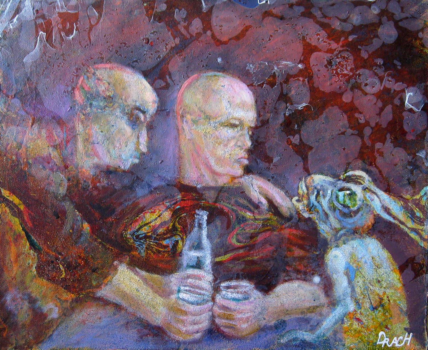 Obraz emanuje surrealistycznym klimatem, w którym trzy postaci o nieco nienaturalnych rysach twarzy zasiadają przy stole. Dominują ciepłe odcienie brązu, bordo i czerwieni, które zdają się otulać scenę niczym mgiełka. Środkowa postać trzyma butelkę i szklankę, a jej cechy mają miękki, rozmyty charakter. Wygląda to jak scena z innego świata, a może nawet sen. Artysta bawi się fakturą i światłem, używając mieszanych technik malarskich. Farba jest nakładana jak gdyby z rustykalnym, chropowatym wykończeniem, dodając obrazu dynamizmu i ruchu. Obraz ten wywołuje uczucie zagubienia w tajemniczym, może trochę niepokojącym świecie. James Bond pewnie też by się tu zgubił! Atmosfera jest pełna niedopowiedzeń, a postaci zdają się prowadzić cichą rozmowę o czymś głęboko skrywanym. Można stracić poczucie czasu, patrząc na te postacie i snując własne historie. A może to tylko wariacja na temat codzienności z odrobiną magii? Każdy detal przyciąga wzrok i zmusza do zastanowienia się nad subtelnymi emocjami skrytymi w tej kolorowej abstrakcji. A ja sobie myślę, czy przypadkiem to nie jest ukryta opowieść o przyjaźni w niezwykłych okolicznościach?