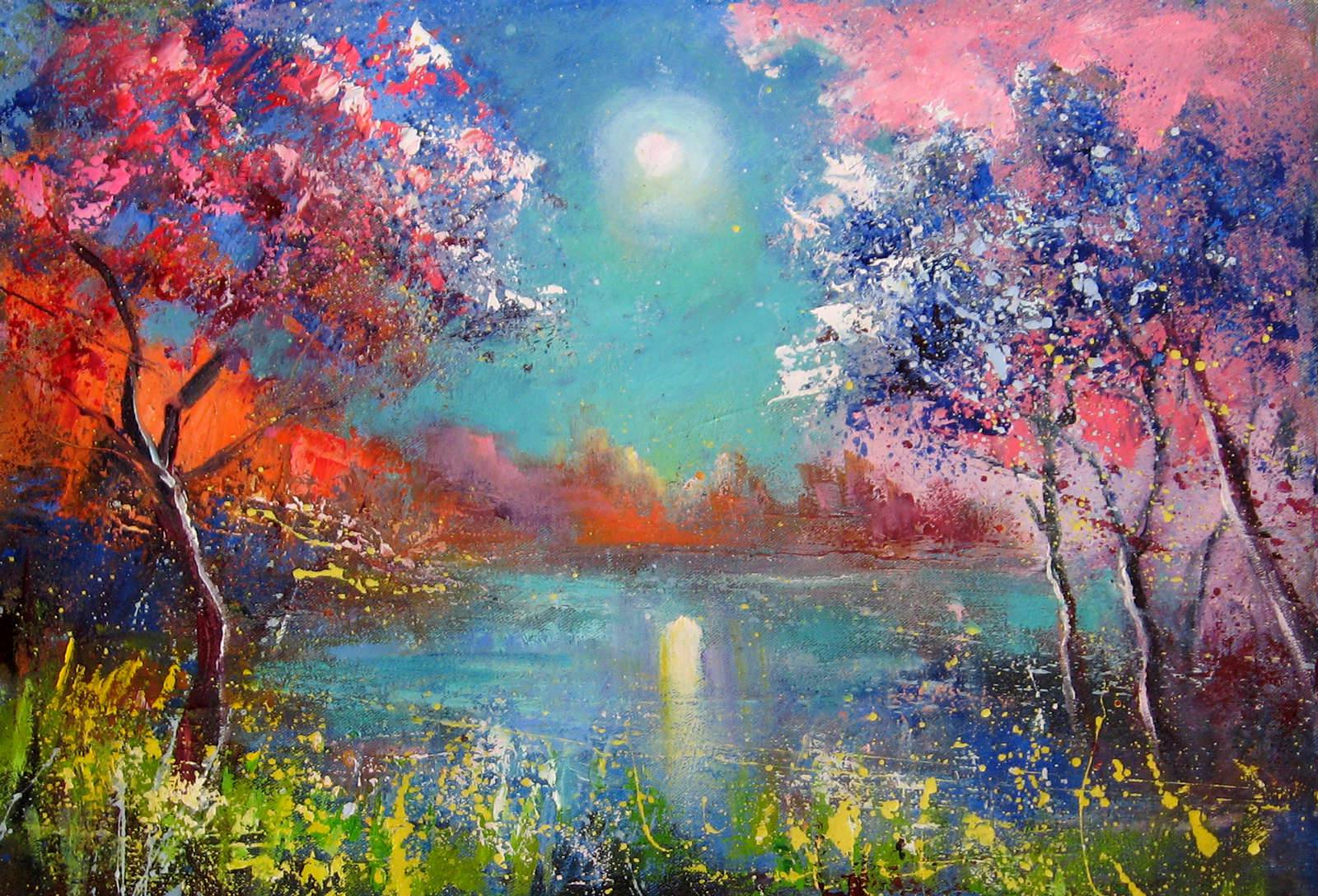 Ten obraz to prawdziwa feeria kolorów. Dominują intensywne odcienie niebieskiego i różu, a pomiędzy nimi przemykają żółcie i zielenie. Krajobraz malujący przed nami jezioro otoczone drzewami emanuje spokojem i tajemniczością. Niby klasyczny pejzaż, ale jest w nim coś magicznego. Księżyc nad horyzontem zalewa całość delikatnym światłem. Farby nałożone są tu z rozmachem, artysta zastosował technikę impasto, co daje obrazowi fakturę i głębię. Można odnieść wrażenie, że drzewa tańczą w takt lekkiego wiatru. Wow, jakie to piękne! Dzieło wpływa na naszą wyobraźnię, budzi wspomnienia z dzieciństwa. Czuję, jakby ktoś przeniósł mnie do innego świata – dreamlike. Może to miejsce, gdzie czas płynie wolniej? Obraz z pewnością zostawia miejsce na własne interpretacje, a jego niecodzienna kompozycja prowokuje do refleksji. Ktoś mógłby powiedzieć, że tu zaczyna się bajka. Ciekawe, co artysta miał na myśli, tworząc to dzieło.