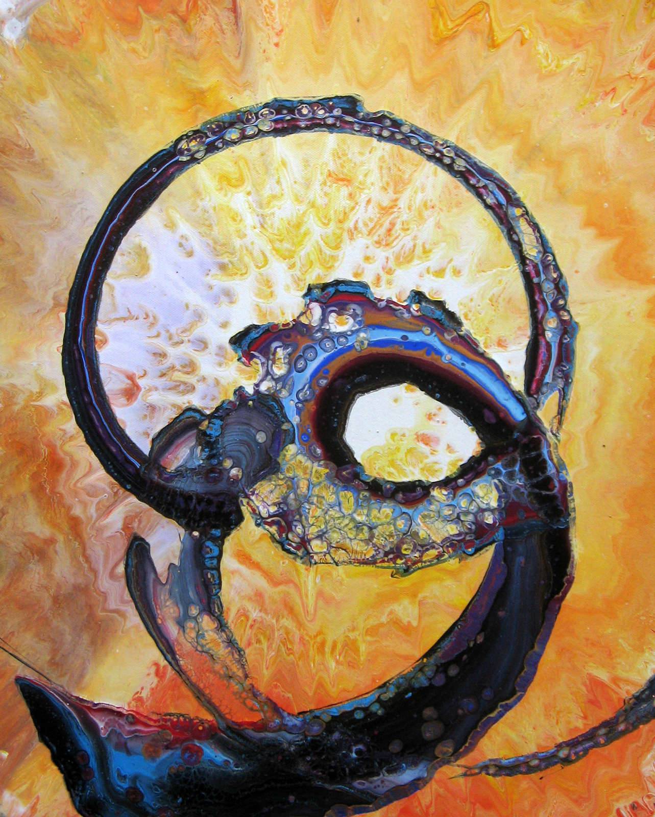 Na obrazie widzimy wirujące formy, skąpane w intensywnej żółci i pomarańczu. Centralnym punktem jest ciemny, pofalowany kształt przypominający spiralę, która tańczy po płótnie. Całość kompozycji zdaje się wybuchać energią, emanując ciepłem i światłem, niczym promienie słońca przebijające się przez burzowe chmury. Artysta wykorzystał dynamiczne przejścia kolorystyczne, które nadają obrazowi ruchu i głębi. Technika przypomina fluid painting, gdzie farby płynnie się przenikają, tworząc efekt płynnego chaosu. Obraz może budzić wiele emocji, od zachwytu po niepokój, bo kto wie, co kryje się w tej spirali? Dla mnie, to trochę jak magiczny kalejdoskop ożywający na oczach widza. Hey, patrz jak to się wszystko kręci! Może właśnie taki miał być efekt – zawrót głowy i eksplozja barw. Patrząc na to dzieło, czuję się jak dziecko w sklepie z cukierkami, nie wiedząc gdzie najpierw spojrzeć. Obraz wciąga, prowokuje do refleksji nad tym, jakie tajemnice mogą kryć się w takiej abstrakcji.