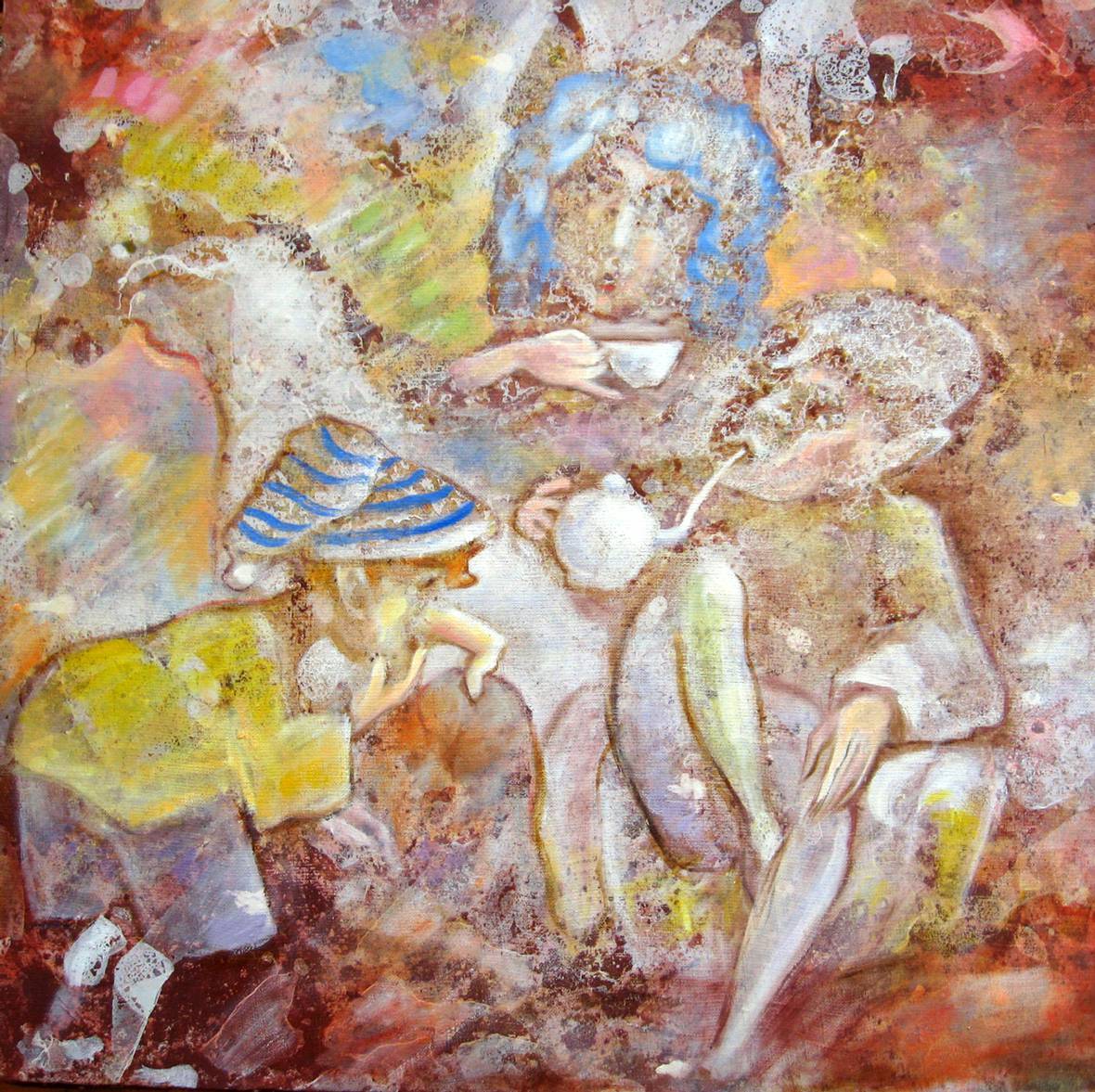 Na obrazie dominują ciepłe odcienie brązów i żółci, przeplatane delikatnymi błękitami i bielą. Kolory są jakby rozmyte, tworząc magiczną i tajemniczą atmosferę. Kompozycja skupia nasz wzrok na trzech postaciach, które zdają się być pochłonięte jakąś niewidzialną rozmową. Jest coś baśniowego w ich wyglądzie, jakby z innego świata. Technika artystyczna jest pełna lekkości i swobody, jakby artysta uchwycił chwilę pełną ruchu. Kształty są nieco zatarte, co dodaje dziełu dynamiki i ulotności. Patrząc na ten obraz, czuję się trochę jakbym wpadł do "Wonderland". Jest w tym coś z dziecięcego snu. Jeden z bohaterów zdaje się pić herbatę z bańki mydlanej - czy to nie jest czyste szaleństwo? Interpretacje obrazu są szerokie. Może to rozmowa o życiu, a może zabawa w udawanie dorosłych? Jest tu lekkość i ulotność, a jednocześnie jakieś niewypowiedziane napięcie. Ten obraz może wywołać różne emocje - od śmiechu po zadumę. Dziecko powiedziałoby: "Patrz, mama, ktoś tu pije z dzbanuszka!". I tyle. Niby śmieszne, a takie prawdziwe. Całość niesie ze sobą coś surrealistycznego, przez co widz czuje się niemal jak uczestnik tej niezwykłej sceny.