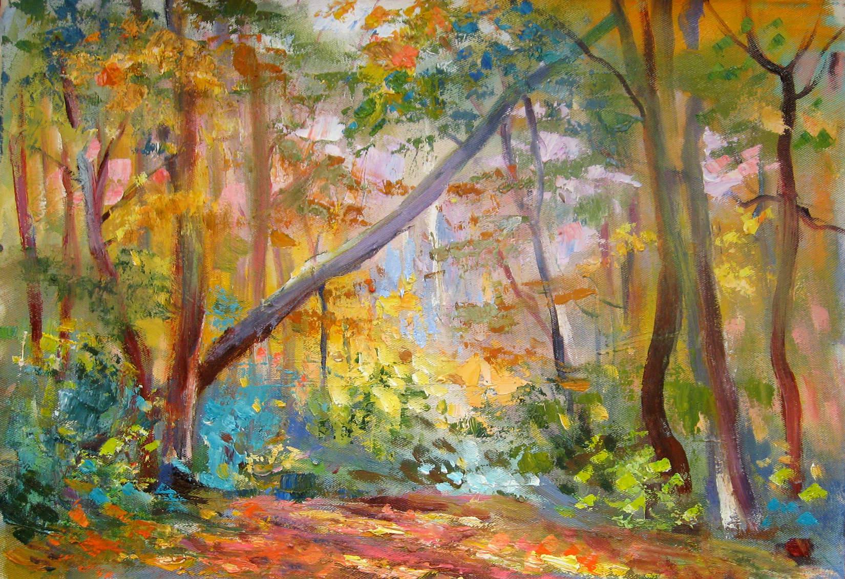 Na obrazie dominuje feeria ciepłych kolorów, jakby cała paleta jesieni została wciśnięta na płótno. Czerwienie, pomarańcze i żółcie mieszają się z zielenią i błękitem, tworząc dynamiczną, niemal taneczną kompozycję. Drzewa, chociaż w swej formie dość nieregularne, zdają się tworzyć harmonijny rytm. Światło prześwieca przez liście, tworząc wrażenie delikatnego, jesiennego popołudnia. Nastrój jest spokojny, ale i pełen życia. Wszystko to sprawia, że obraz oddziałuje na wyobraźnię, prowokując do osobistych refleksji. Styl malarski jest impresjonistyczny, z widocznymi, ekspresyjnymi pociągnięciami pędzla, które dodają spontaniczności i energii. Technika ta sprawia, że motyw staje się niemalże żywy, emanując ciepłem i nostalgia. Patrząc na to dzieło, można poczuć, jak dusza wyrywa się ku wolności, a oczy przestają wędrować po szczegółach, myśląc jedynie "it's beautiful". Mały chłopiec powiedziałby: "Patrz, ile kolorów!" Obraz przywołuje lato i jesień, razem. Wywołuje tęsknotę za chwilą zatrzymaną gdzieś pomiędzy czasem a przestrzenią.