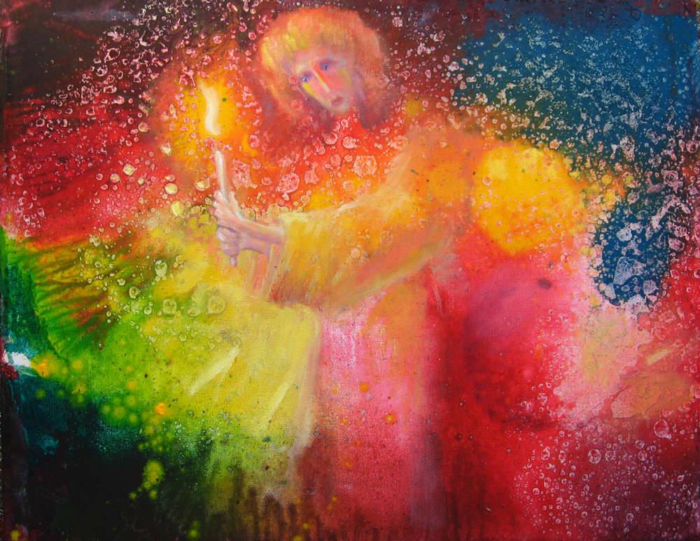 Obraz tętni życiem kolorów. Ogniste czerwienie i intensywne żółcie mieszają się z zielenią i niebieskim, tworząc wybuchowy kalejdoskop. Centralnym punktem jest postać trzymająca świecę, której płomień rozjaśnia twarz, tworząc atmosferę tajemnicy. Cała scena wygląda jakby była pokryta drobnymi kropelkami wody, co dodaje jej magicznego nastroju. To jakby ktoś uchwycił świt w metaforycznej formie. Klimat jest nieco surrealistyczny, a jednocześnie ciepły, jak sen, w którym trudno jest odróżnić granicę między rzeczywistym a wyimaginowanym. Technika artysty przypomina coś z pogranicza impresjonizmu i abstrakcji – niesamowite połączenie, które przyciąga i nie pozwala oderwać wzroku. Patrząc na to, czuję się jak dziecko odkrywające świat pełen cudów. Amazing, prawda? Moja interpretacja to poszukiwanie światła w chaosie. Trochę jak życie, nie? Każdy znajdzie tu coś innego, swoje własne odbicie pragnienia, blasku, nadziei.