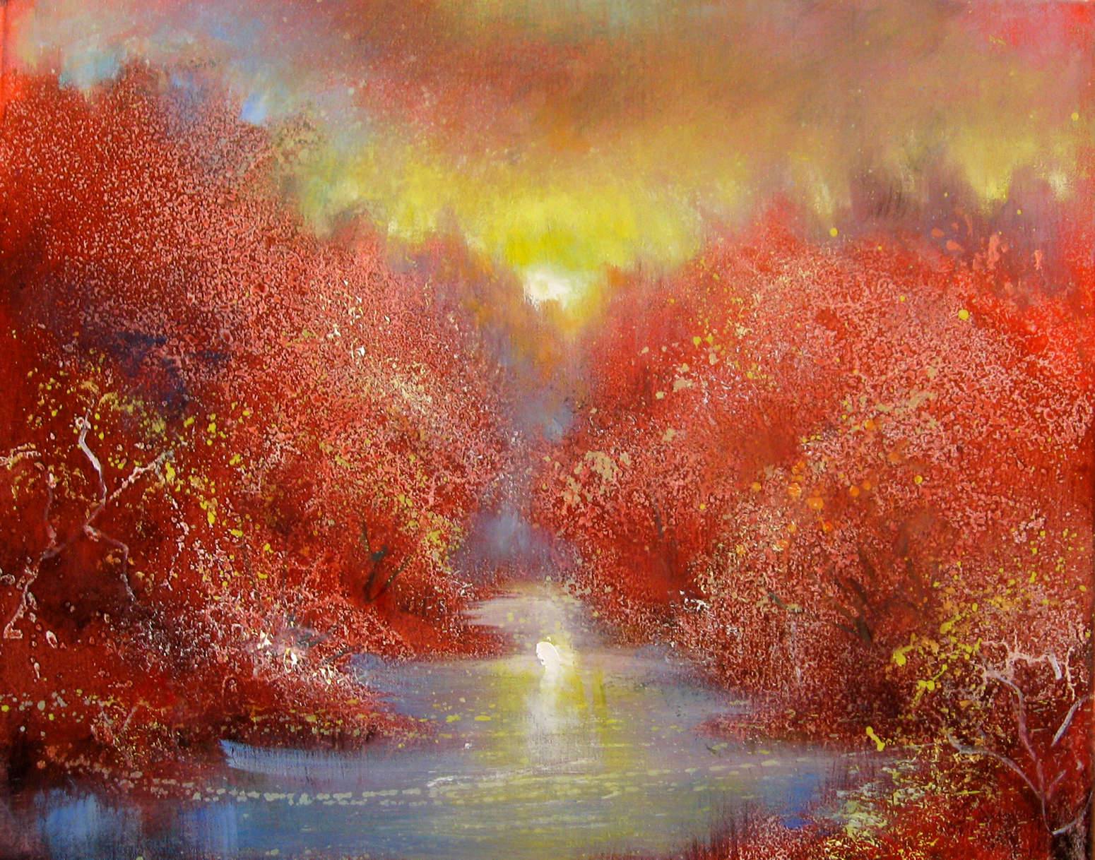 Krajobraz na obrazie jest jak bajeczna kraina, pełna intensywnych czerwieni i żółci. Dominują ciepłe odcienie, które płynnie mieszają się z delikatnymi akcentami błękitu. Kształty drzew spowite są drobną mgiełką, co przypomina magiczną scenę z opowieści. Pośrodku płynie rzeka, odbijając niespokojne niebo. Kompozycja skupia się na centralnym punkcie, prowadząc wzrok w głąb tajemniczego lasu. Atmosfera jest wręcz mistyczna. Czuję się jakbym był jedną z osób poszukujących ukrytych tajemnic. Obraz emanuje spokojem, ale jednocześnie coś w nim pulsuje energią. To jak mieszanka nostalgia i dreamy marzenia. Artysta użył techniki impastu, tworząc fakturę przypominającą dotyk natury. Pociągnięcia pędzla są dynamiczne, co dodaje obrazu życia. Wygląda, jakby kolory same tańczyły po płótnie. Jest coś magicznego w tej swobodzie i energii. Patrząc na ten obraz, można poczuć się jak podczas jesiennej wyprawy do lasu. Dzieło może wywołać w odbiorcy uczucie spokoju i zadumy nad pięknem natury. Przyciąga uwagę i sprawia, że człowiek chce zatrzymać się na chwilę, pomyśleć. Czy to nie jest trochę jak w bajce? Słońce tam świeci tak ładnie i wszystko jest czerwone. Wow. To by napisało dziecko. Ja osobiście uważam, że obraz jest jak dream do odkrycia, pełen tajemnic i emocji, które można zrozumieć na różne sposoby.